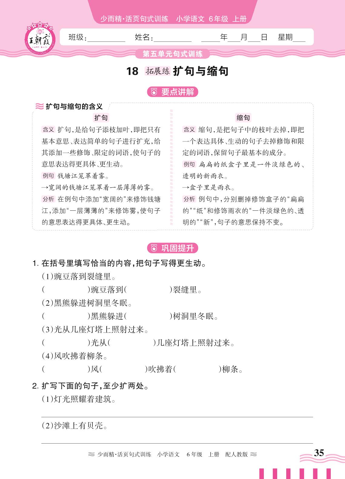 2024秋上册六年级语文人教版 第五单元句式训练——18. 扩句与缩句