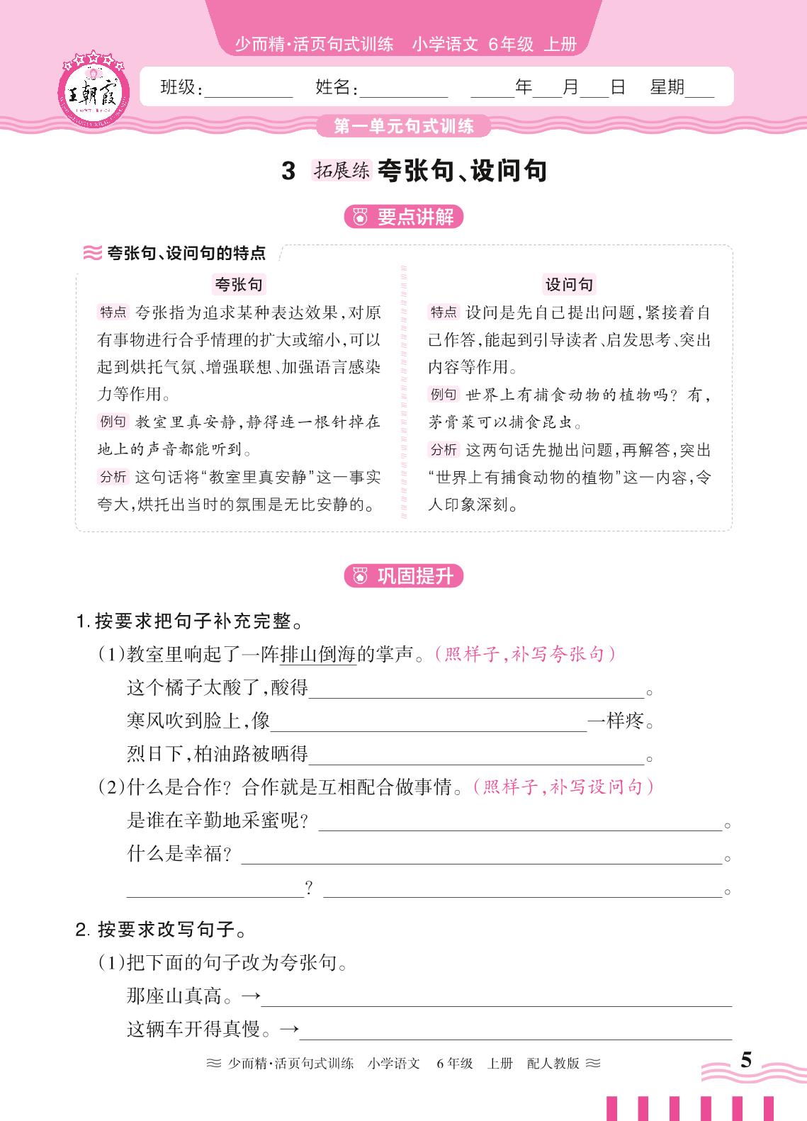 2024秋上册六年级语文人教版 第一单元句式训练——3. 夸张句、设问句