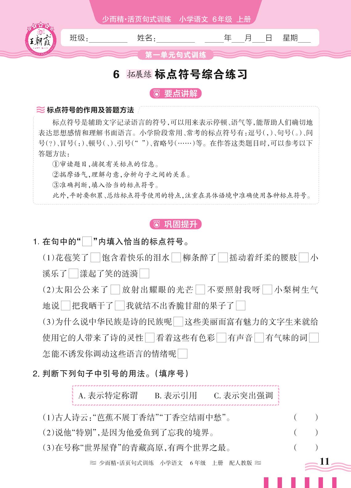 2024秋上册六年级语文人教版 第一单元句式训练——6. 标点符号综合练习