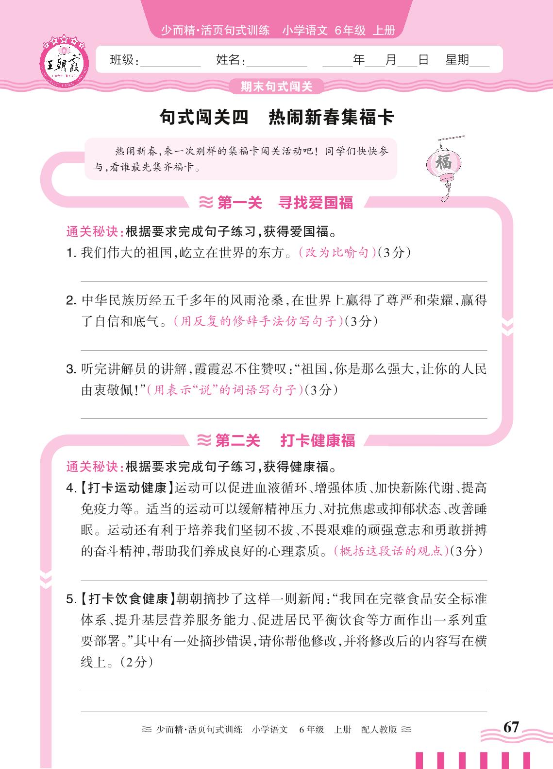 2024秋上册六年级语文人教版 期末句式闯关——句式闯关四:热闹新春集福卡