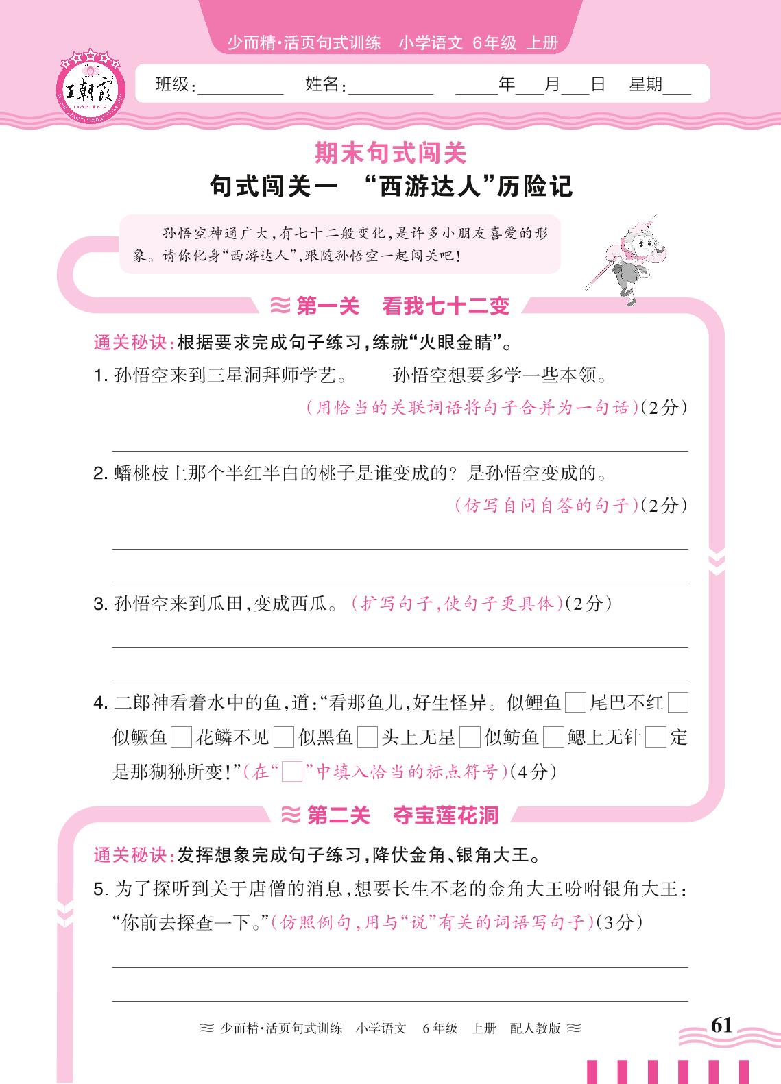 2024秋上册六年级语文人教版 期末句式闯关——句式闯关一:“西游达人”历险记