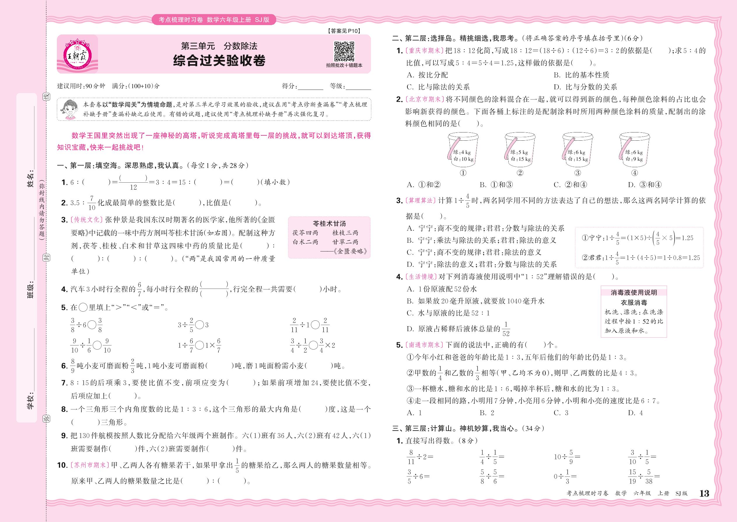 2024秋上册六年级数学苏教版 第三单元 综合过关验收卷