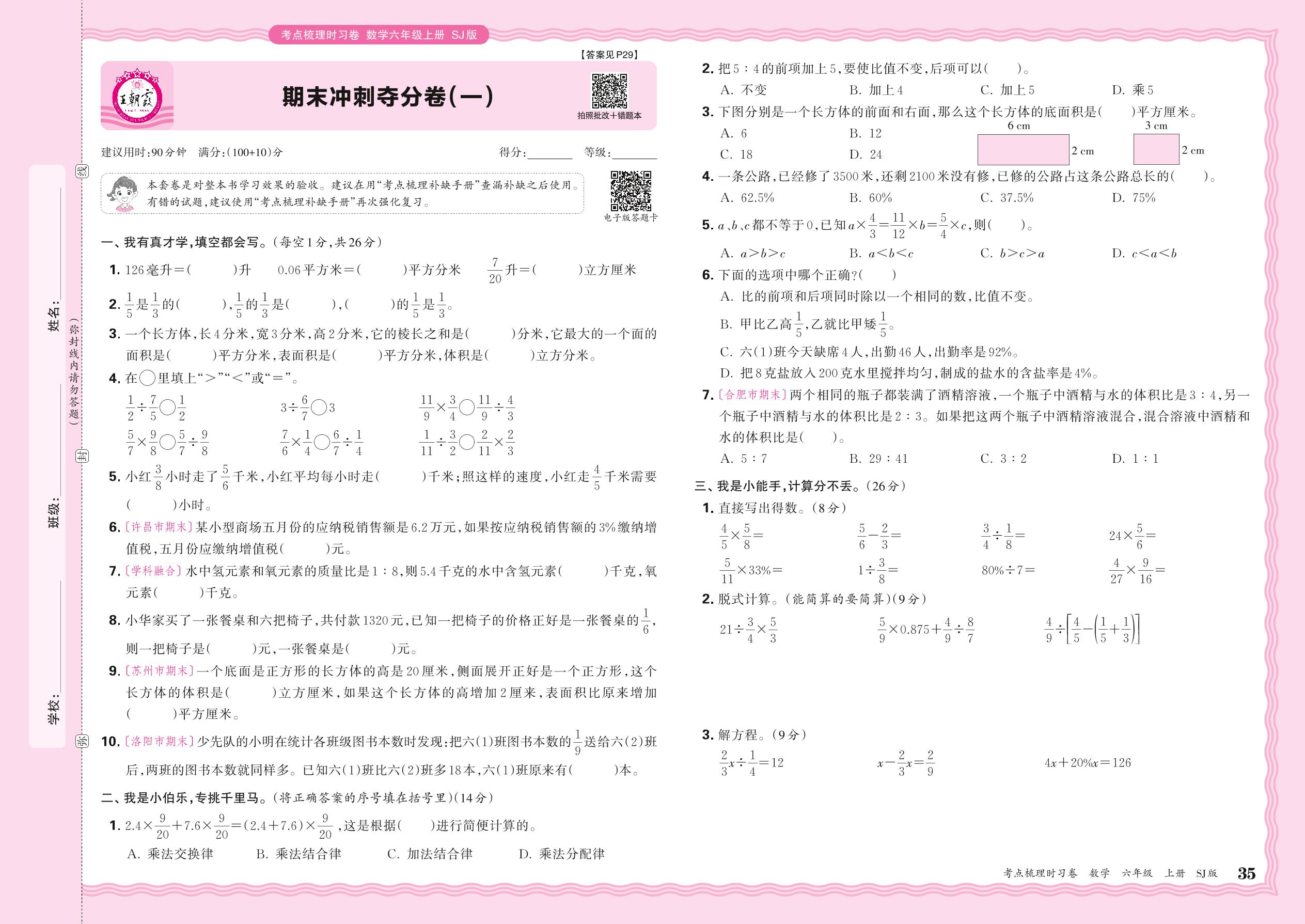 2024秋上册六年级数学苏教版 期末冲刺夺分卷(一)