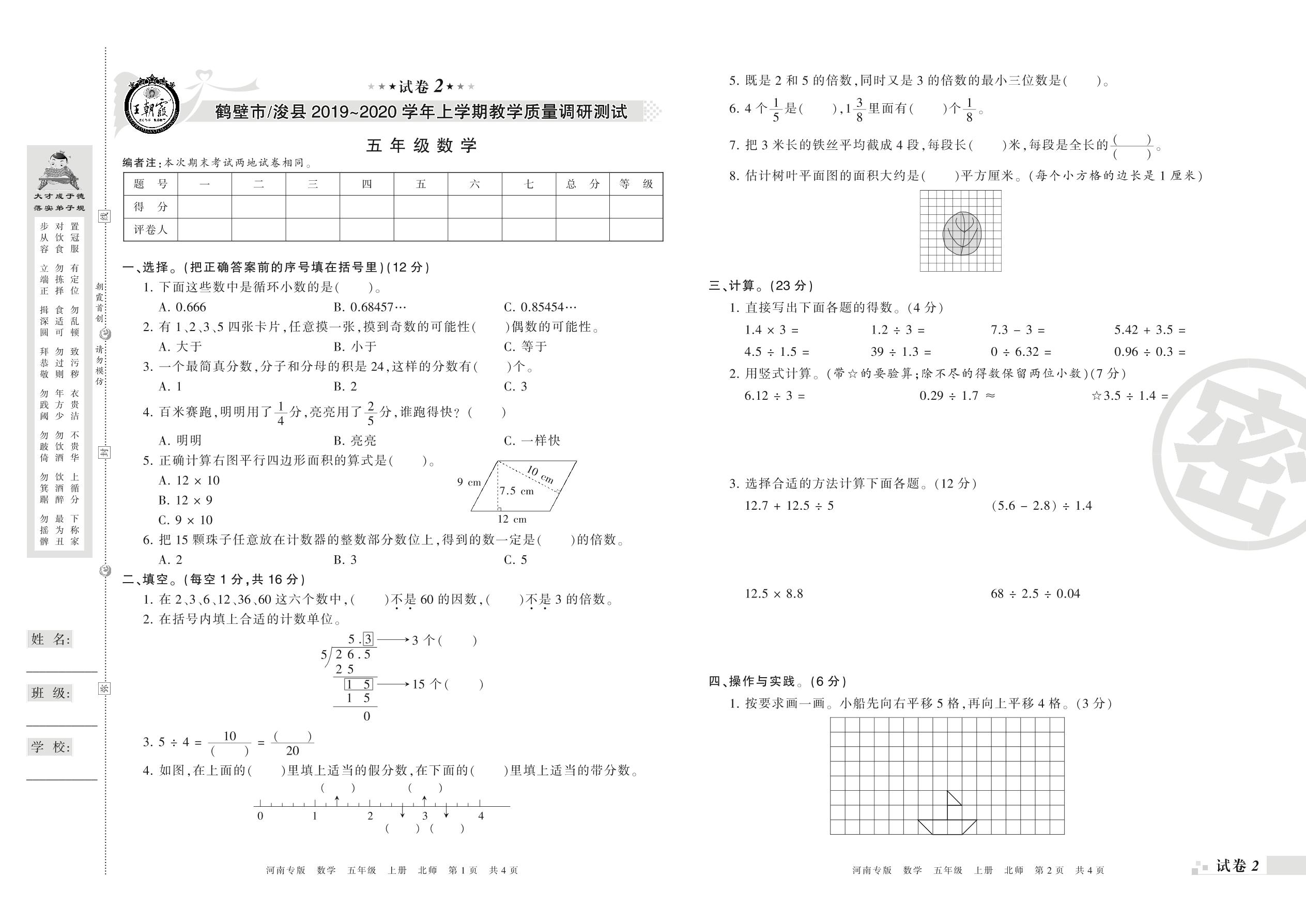 2019-2020学年第一学期鹤壁市、浚县五年级数学试卷(北师版)【2】