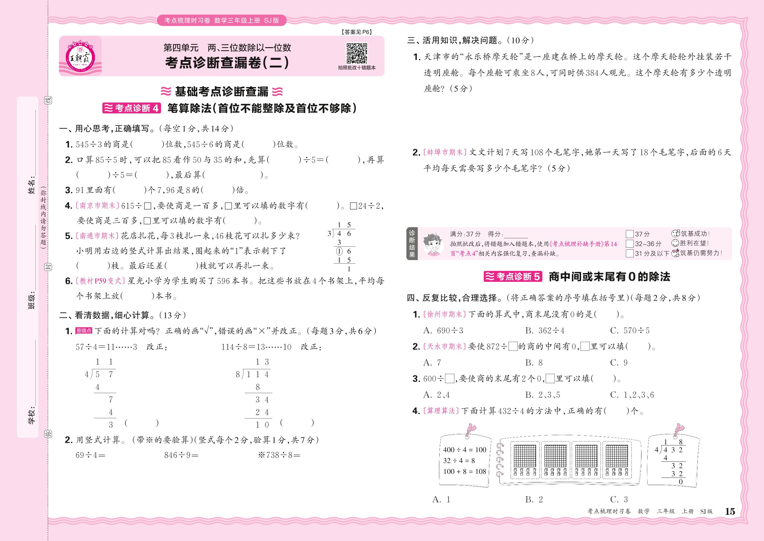 2024秋上册三年级数学苏教版 第四单元 考点诊断查漏卷(二)