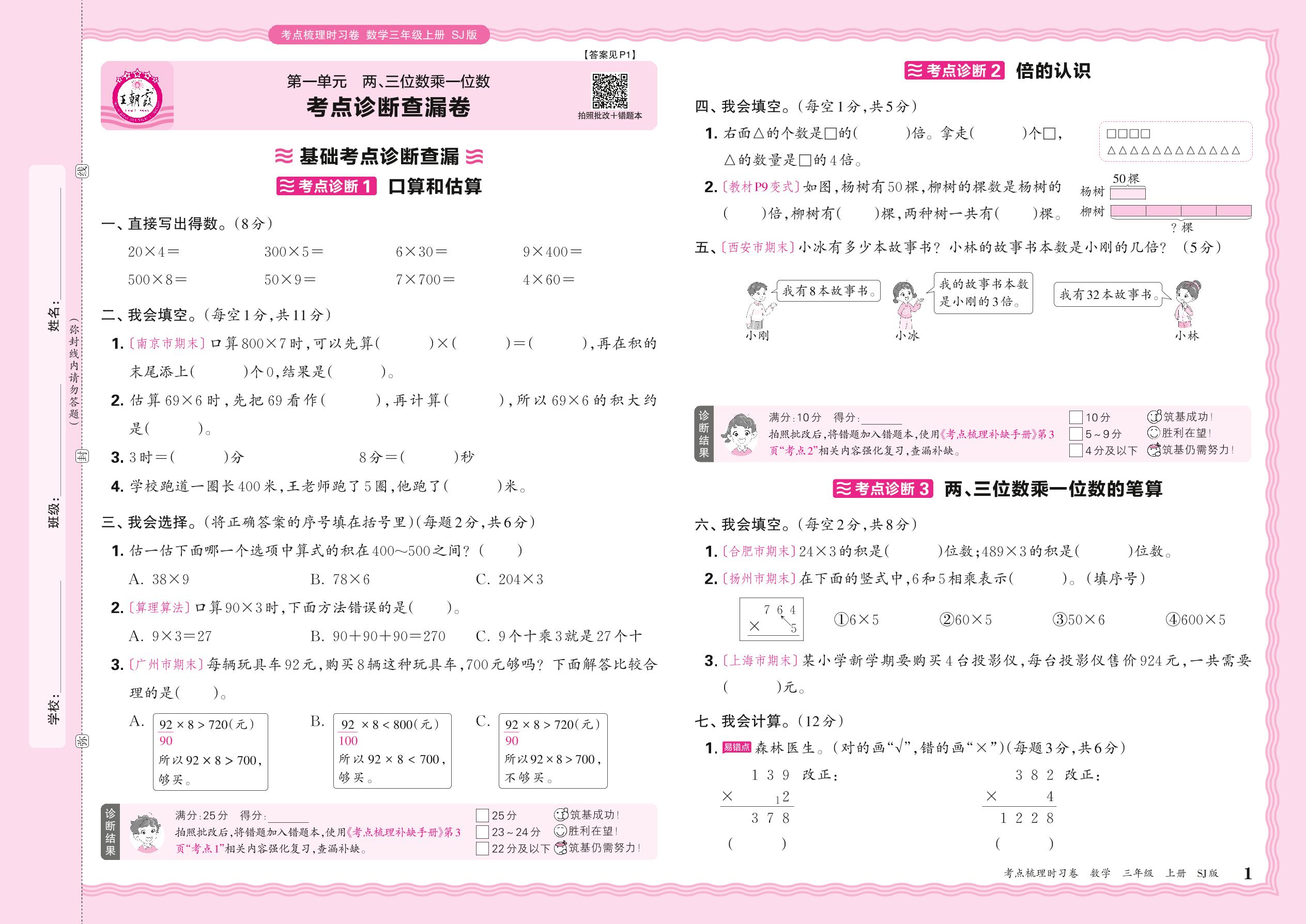 2024秋上册三年级数学苏教版 第一单元 考点诊断查漏卷