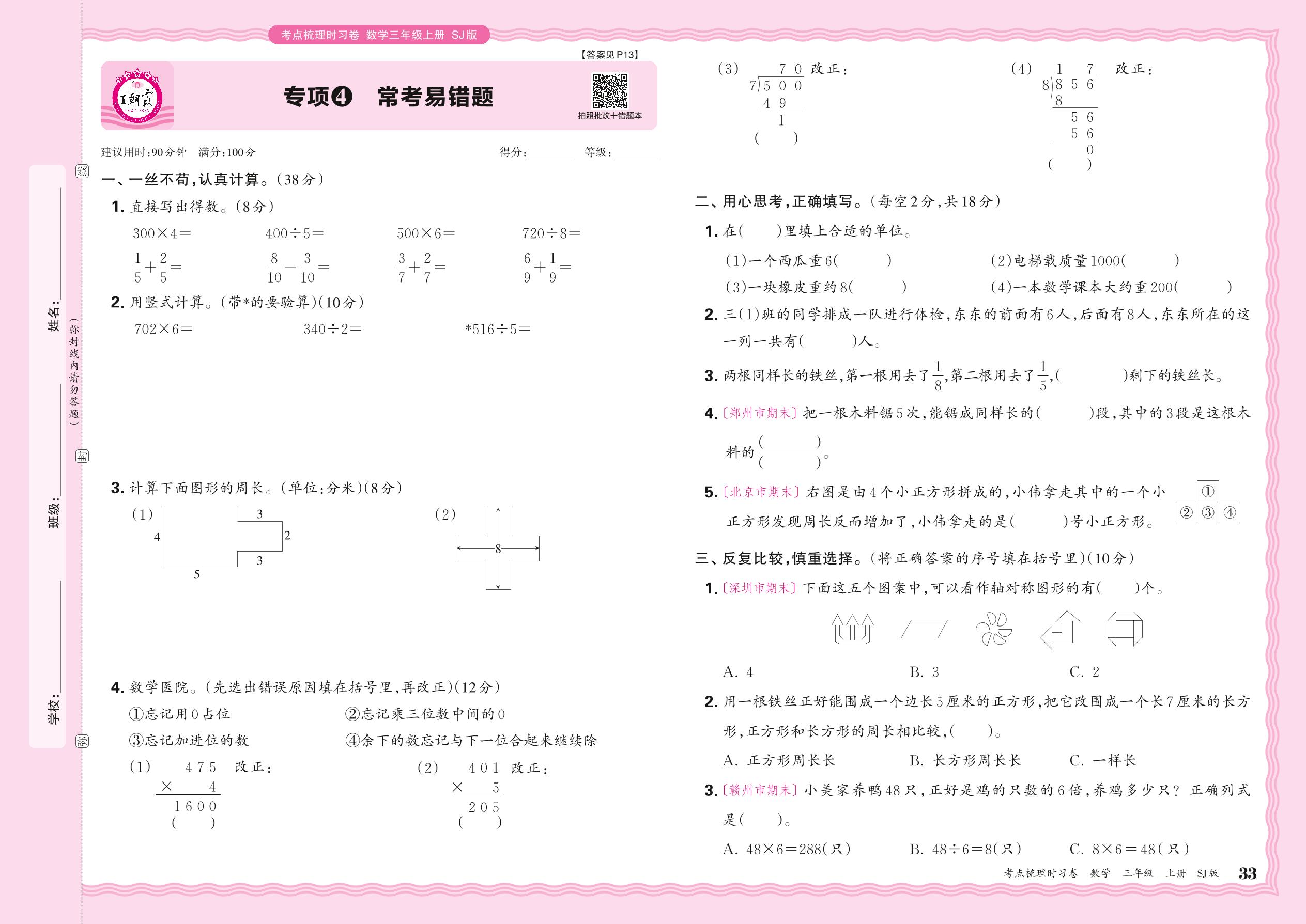 2024秋上册三年级数学苏教版 期末专项卷KD版·常考易错题【4】