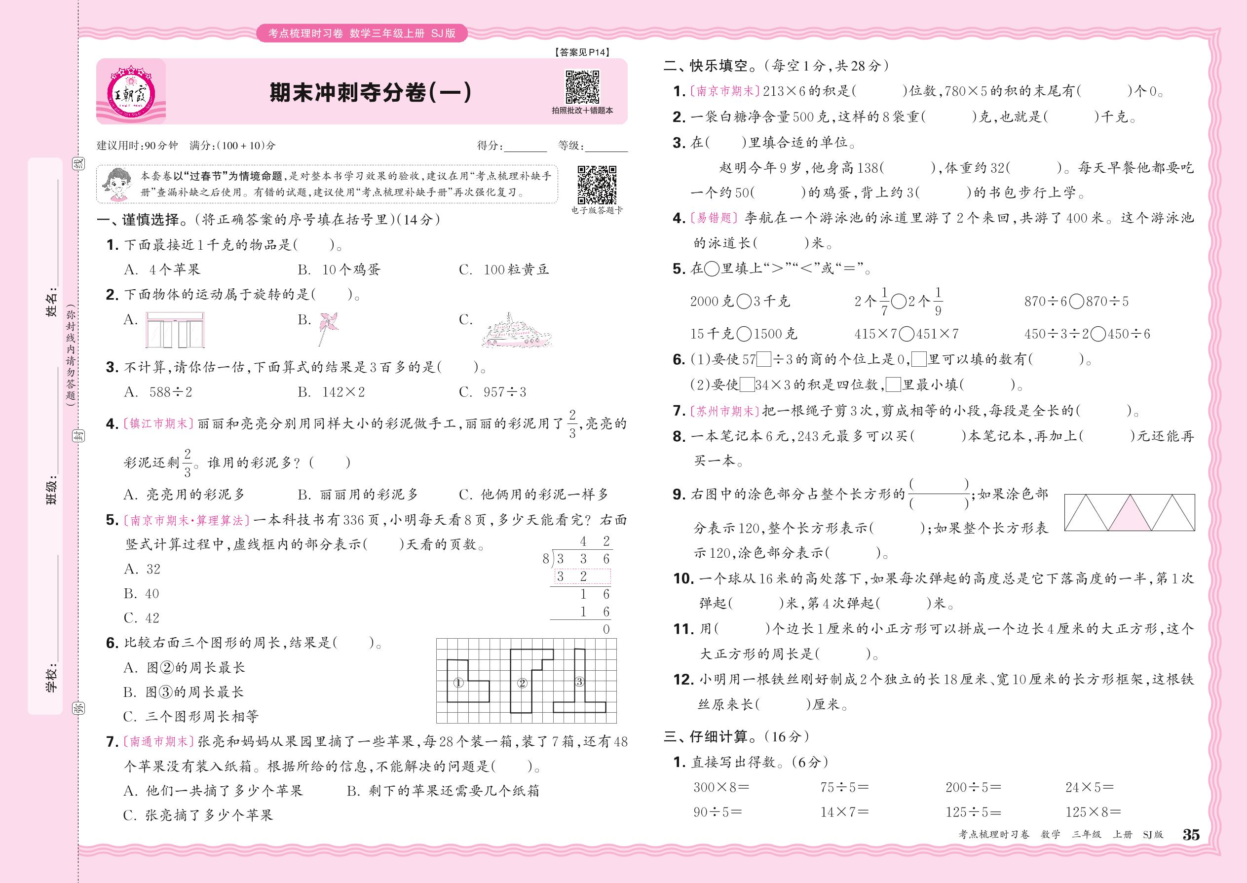 2024秋上册三年级数学苏教版 期末冲刺夺分卷(一)
