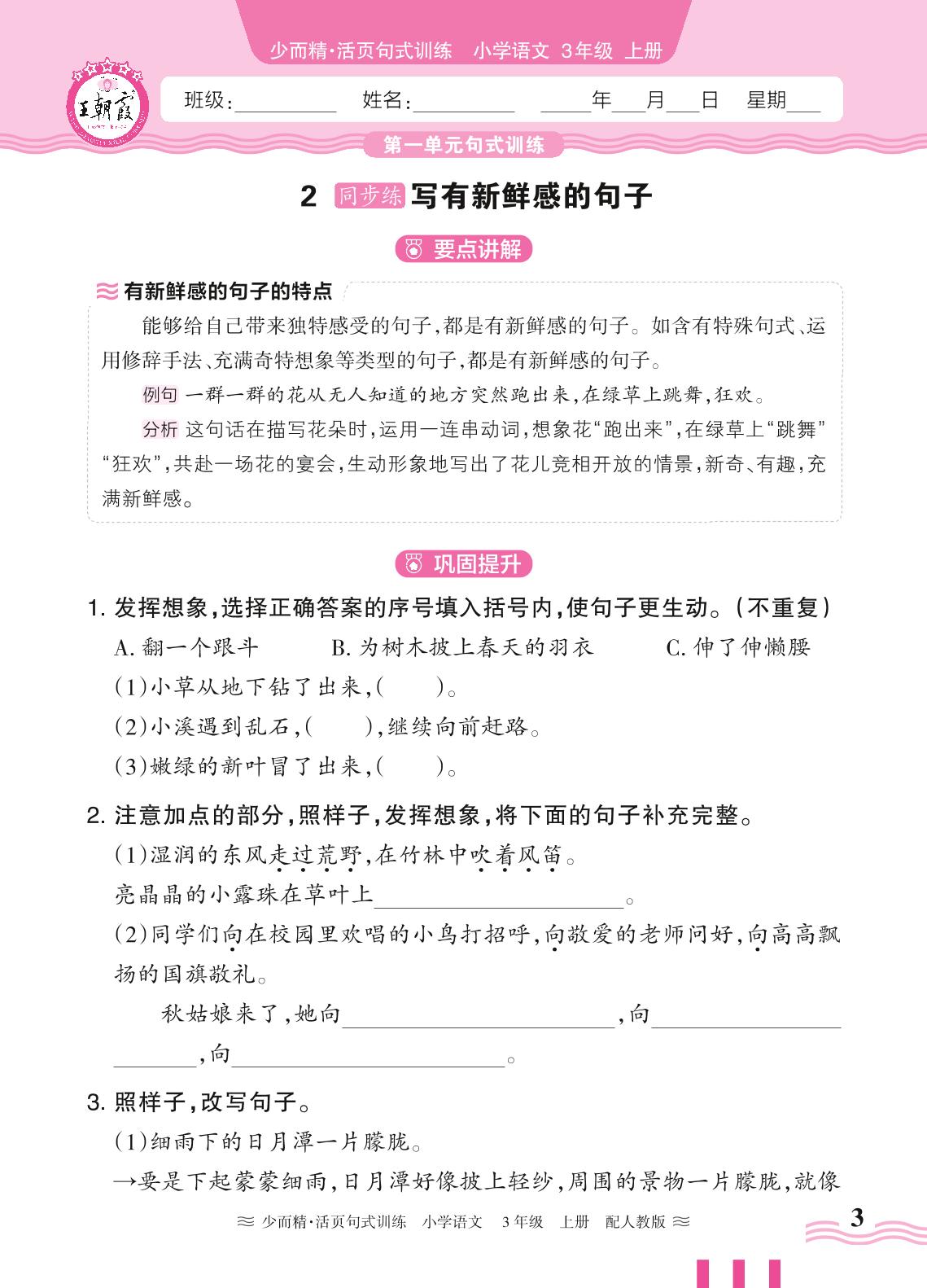 2024秋上册三年级语文人教版 第一单元句式训练——2. 写有新鲜感的句子