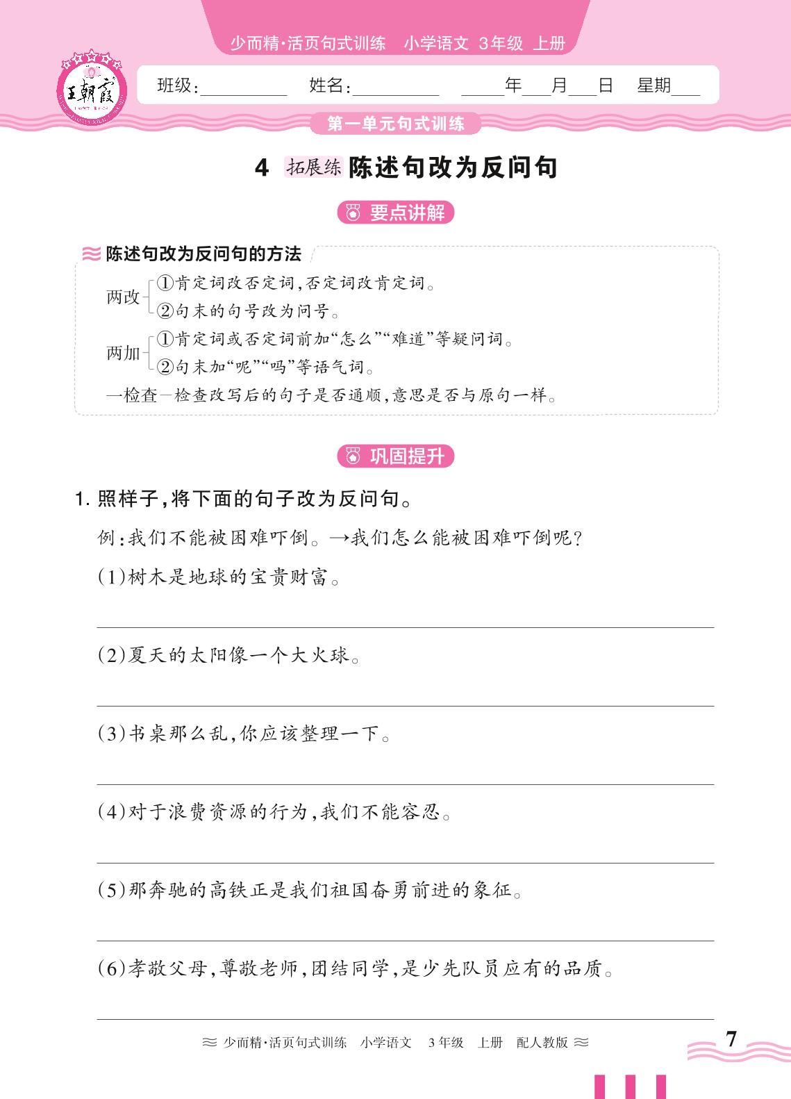 2024秋上册三年级语文人教版 第一单元句式训练——4. 陈述句改为反问句