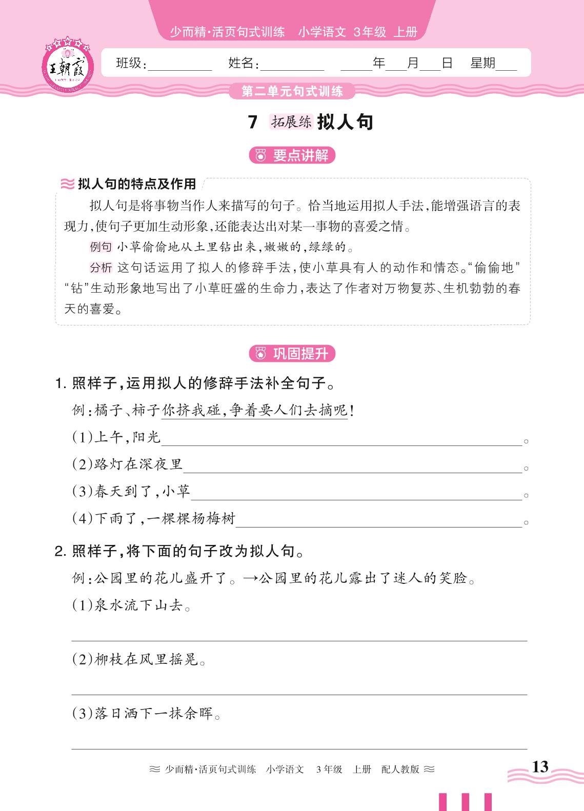 2024秋上册三年级语文人教版 第二单元句式训练——7. 拟人句