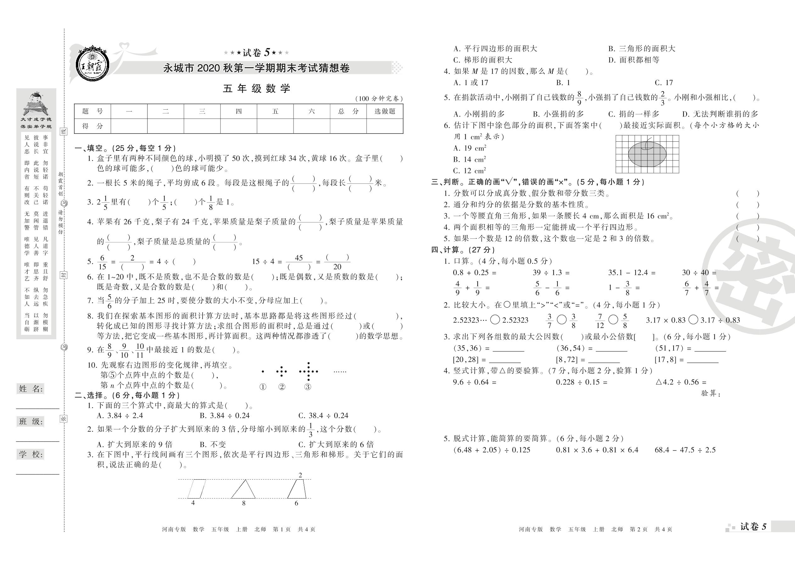 2019-2020学年第一学期永城市五年级数学试卷(北师版)【5】