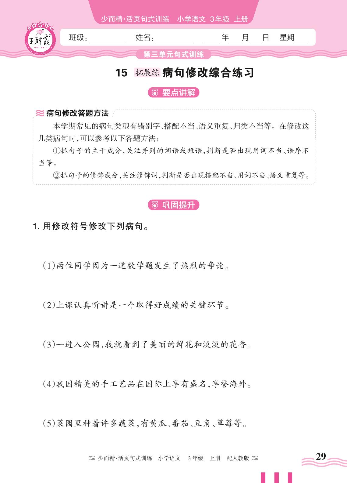 2024秋上册三年级语文人教版 第三单元句式训练——15. 病句修改综合练习