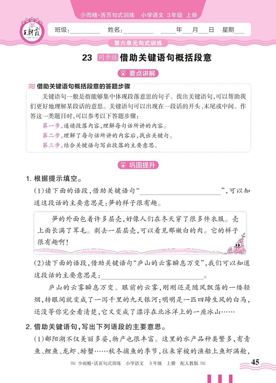 2024秋上册三年级语文人教版 第六单元句式训练——23. 借助关键语句概括段意