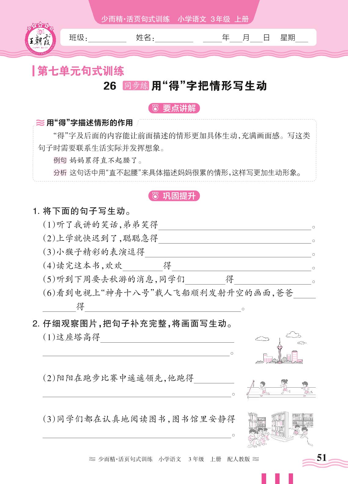 2024秋上册三年级语文人教版 第七单元句式训练——26. 用“得”字把情形写生动