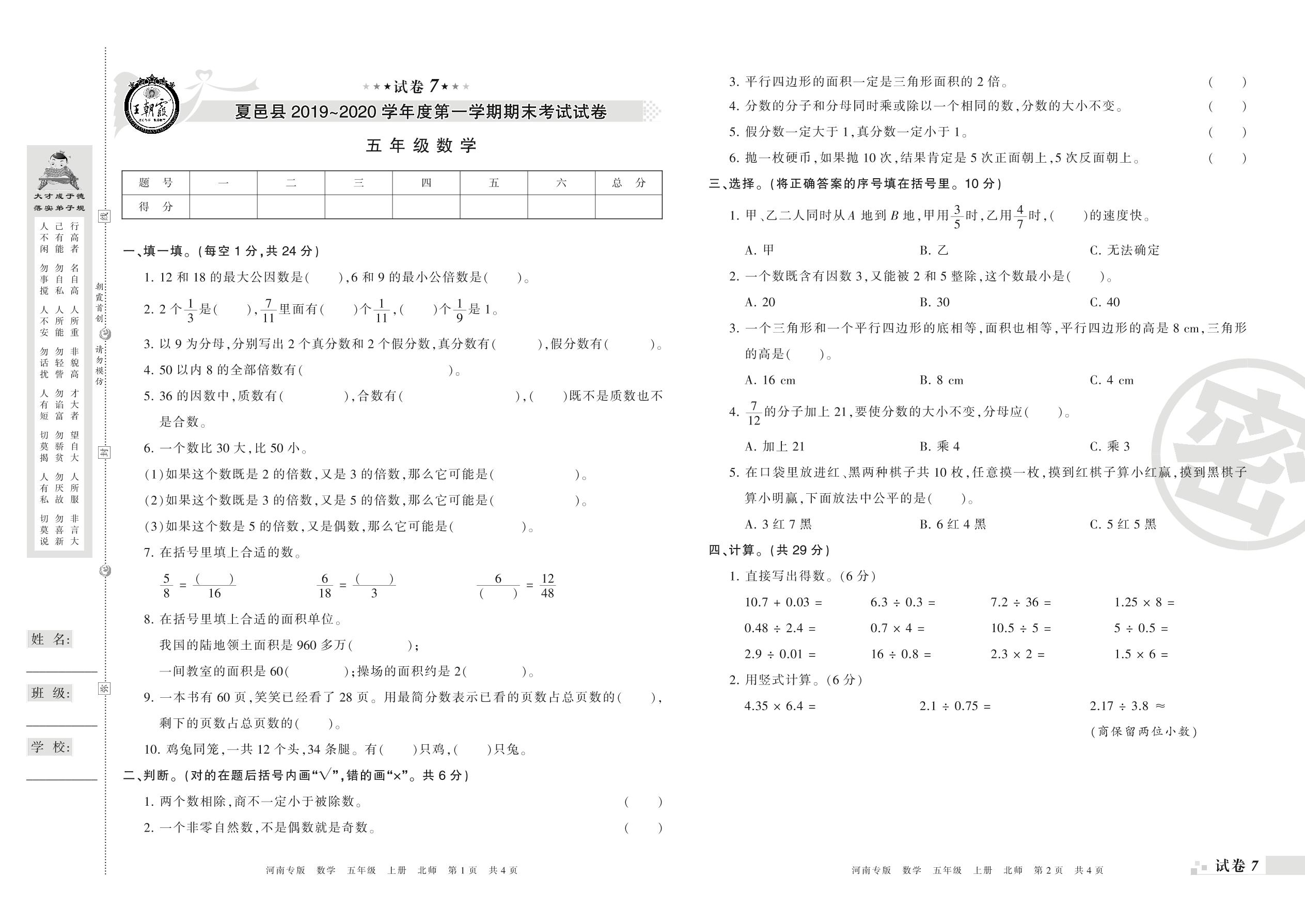 2019-2020学年第一学期商丘市夏邑县五年级数学试卷(北师版)【7】
