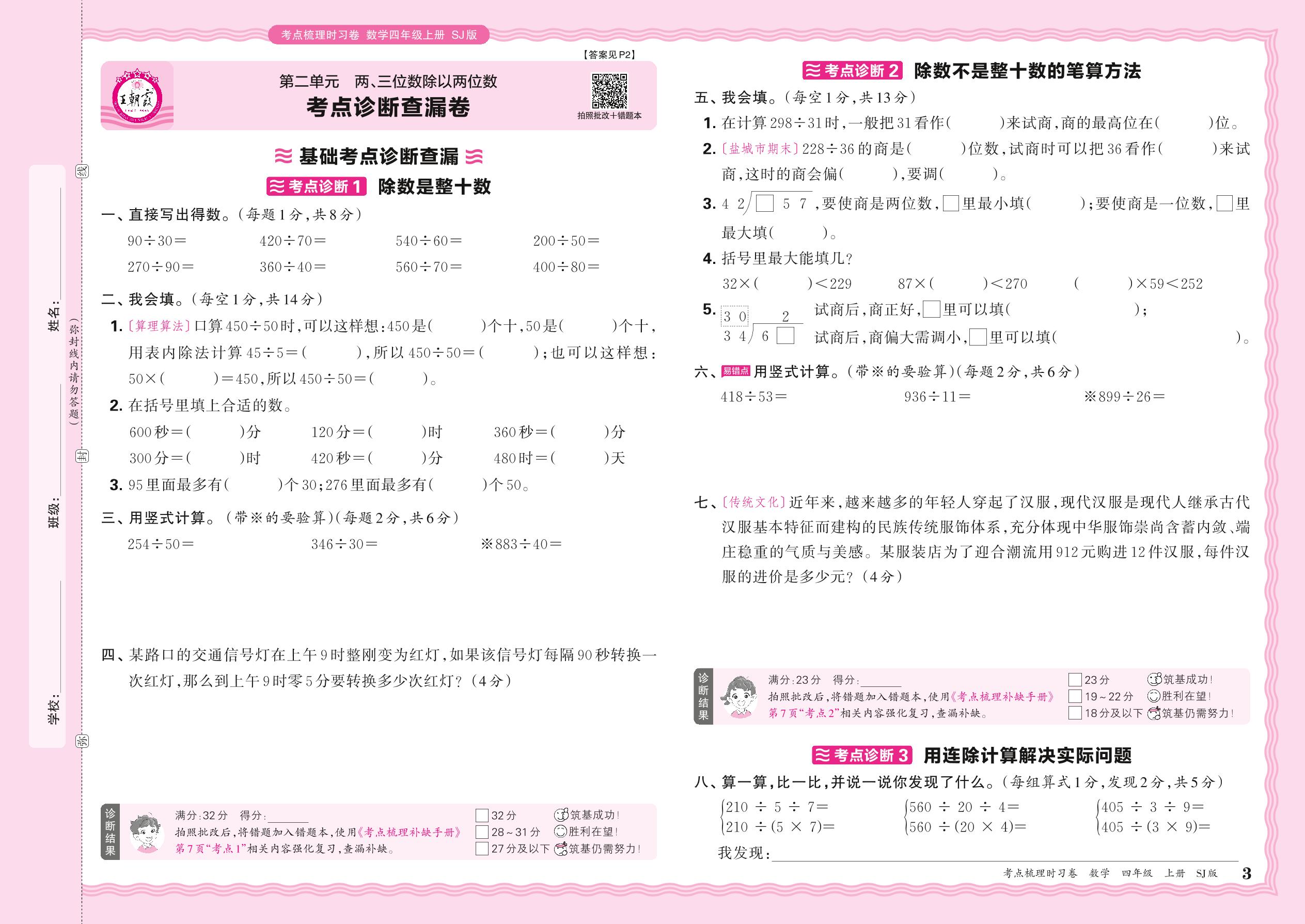 2024秋上册四年级数学苏教版 第二单元 考点诊断查漏卷