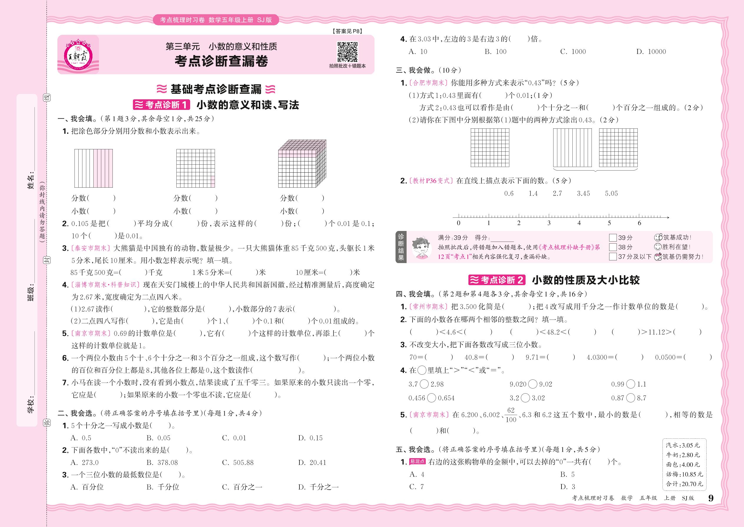 2024秋上册五年级数学苏教版 第三单元 考点诊断查漏卷