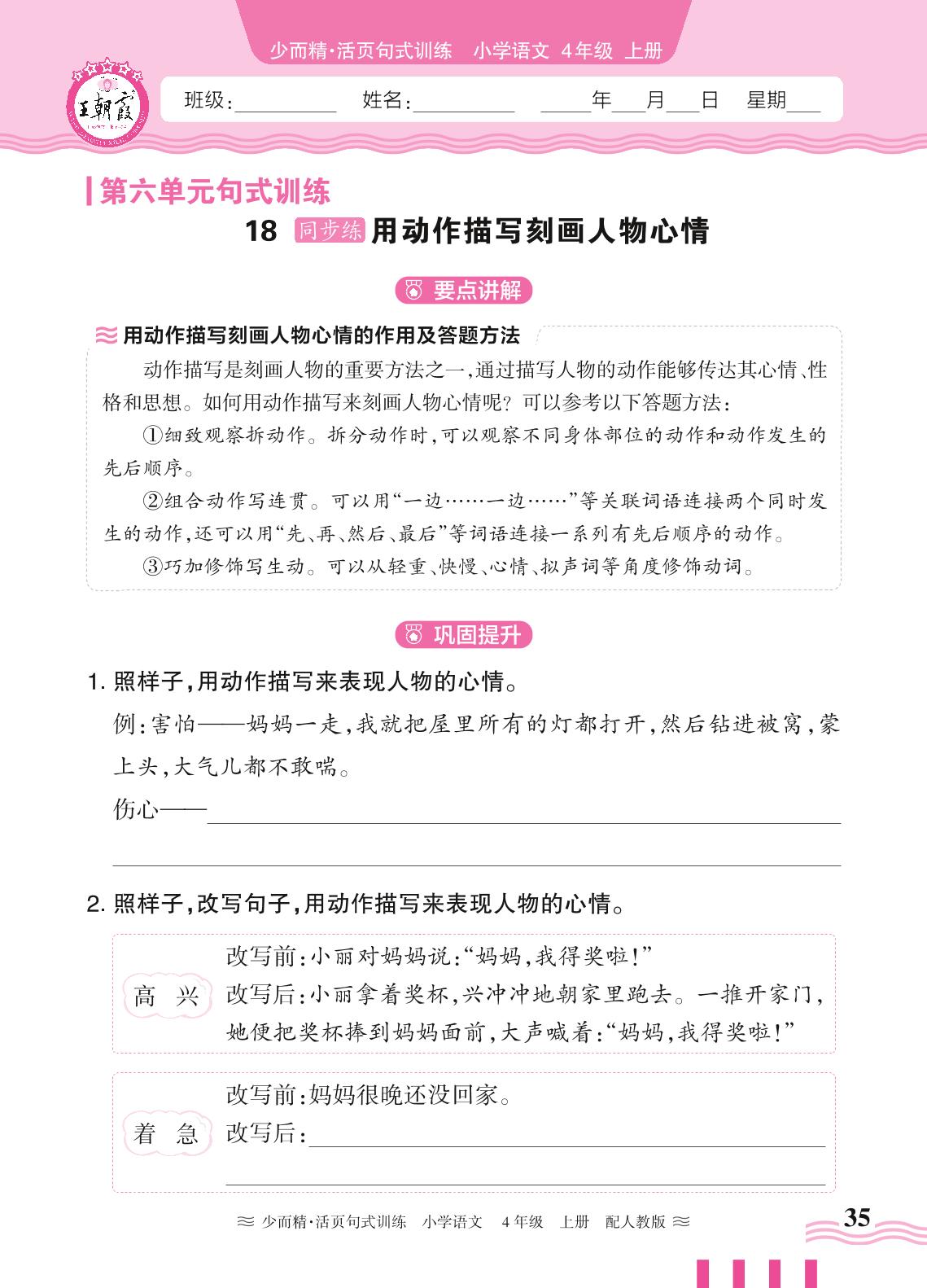 2024秋上册四年级语文人教版 第六单元句式训练——18. 用动作描写刻画人物心情