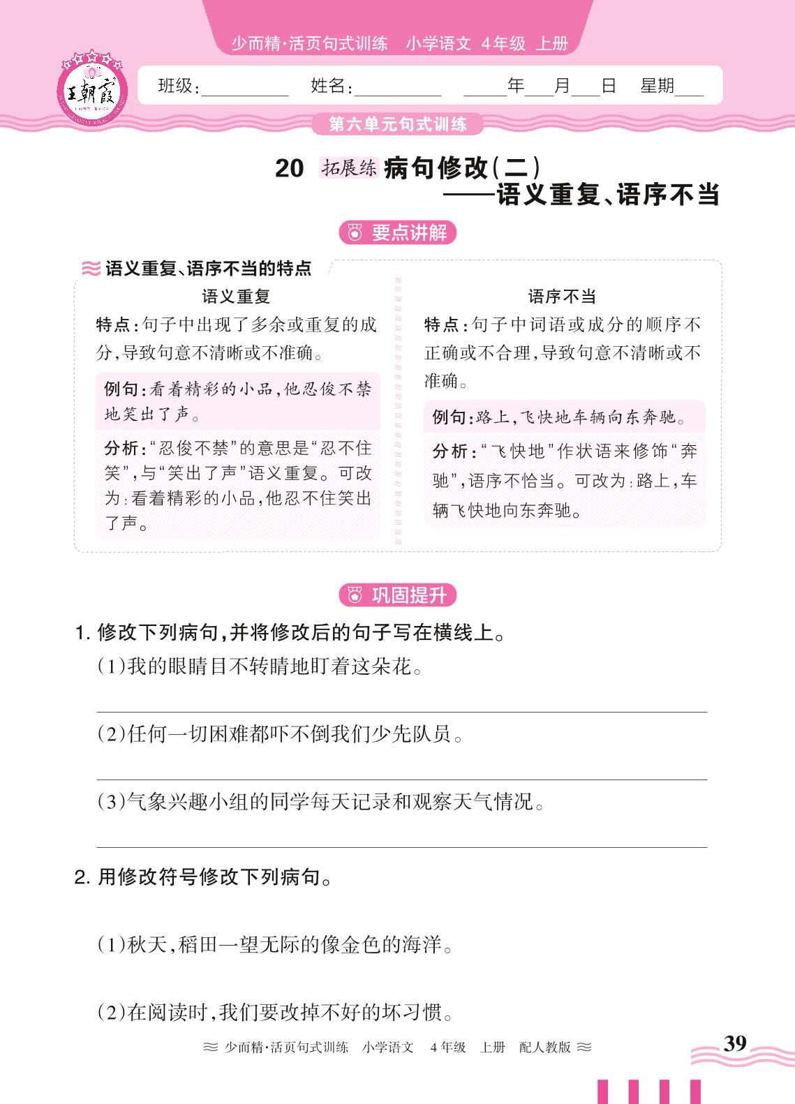 2024秋上册四年级语文人教版 第六单元句式训练——20. 病句修改二:语义重复、语序不当