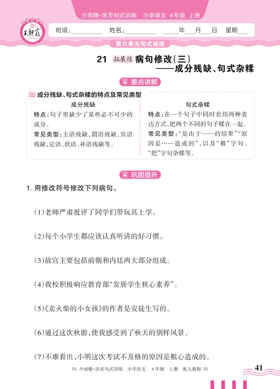 2024秋上册四年级语文人教版 第六单元句式训练——21. 病句修改三:成分残缺、句式杂糅