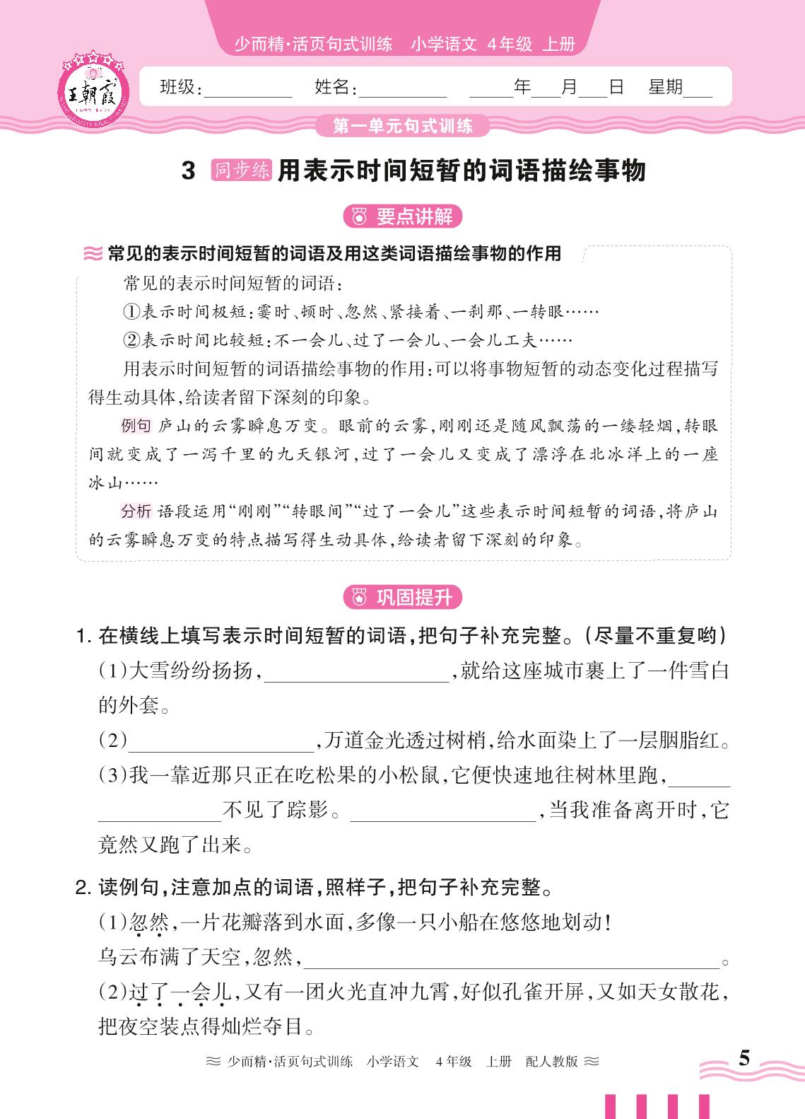 2024秋上册四年级语文人教版 第一单元句式训练——3. 用表示时间短暂的词语描绘事物