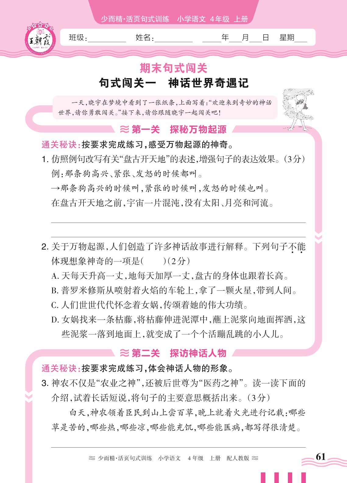2024秋上册四年级语文人教版 期末句式闯关——句式闯关一:神话世界奇遇记