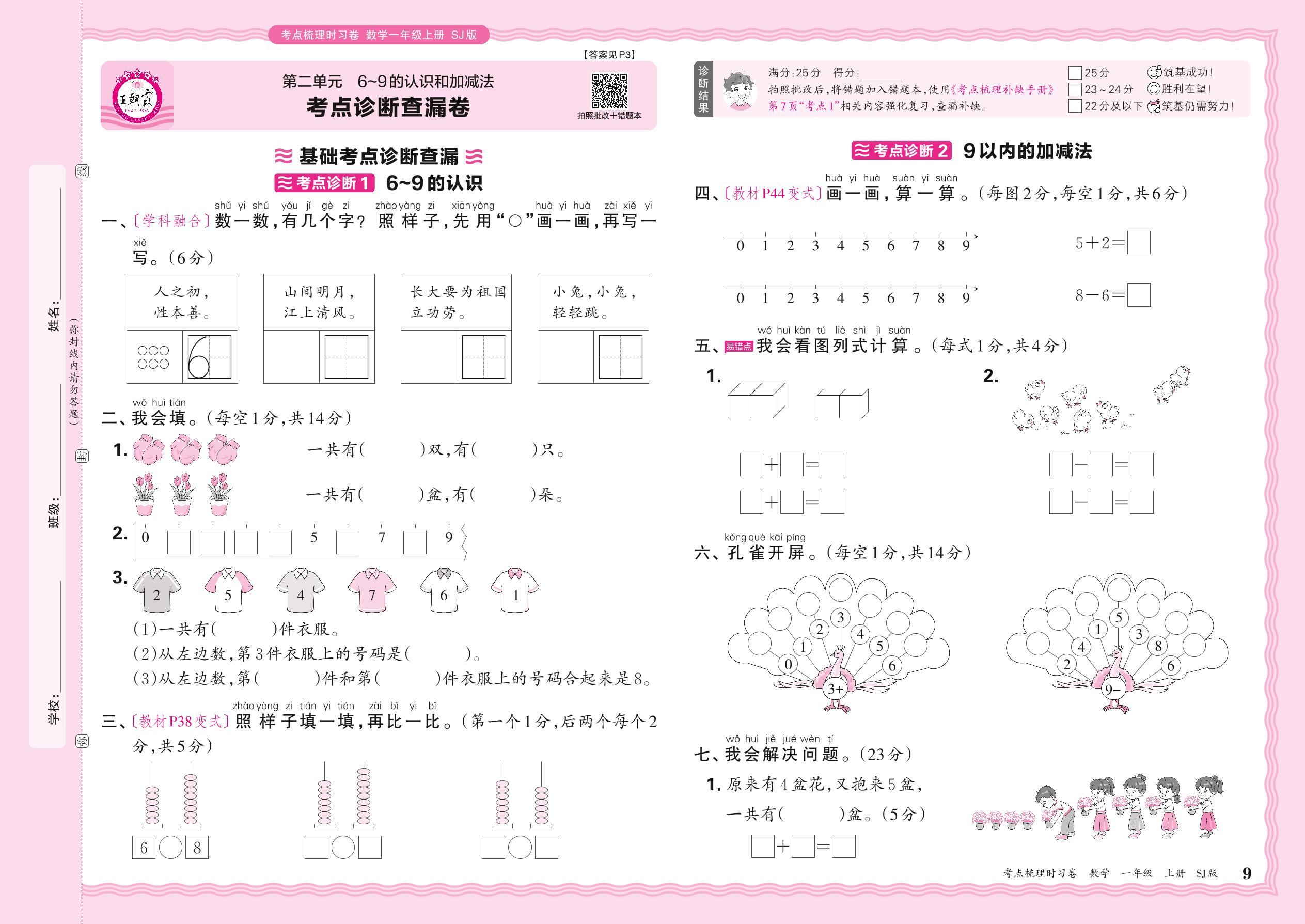 2024秋上册一年级数学苏教版 第二单元 考点诊断查漏卷