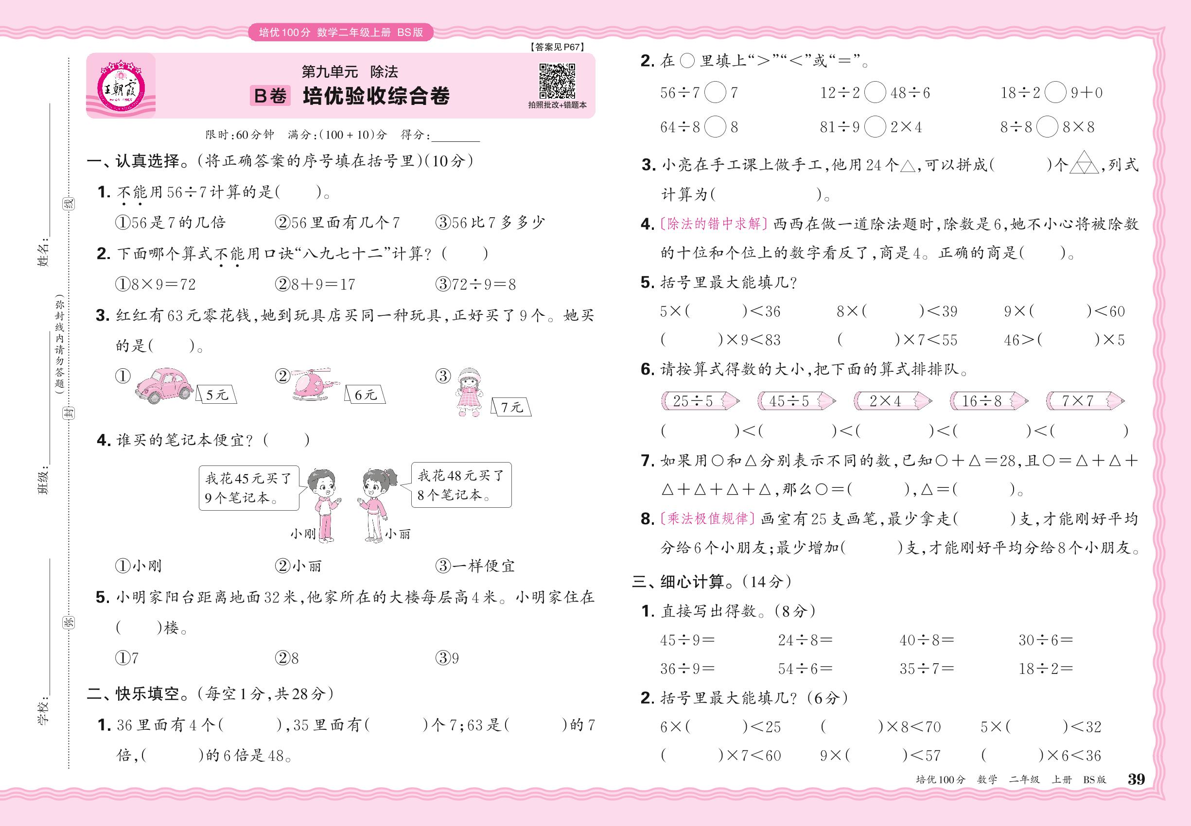 2024秋上册二年级数学北师版 第九单元B卷 培优验收综合卷