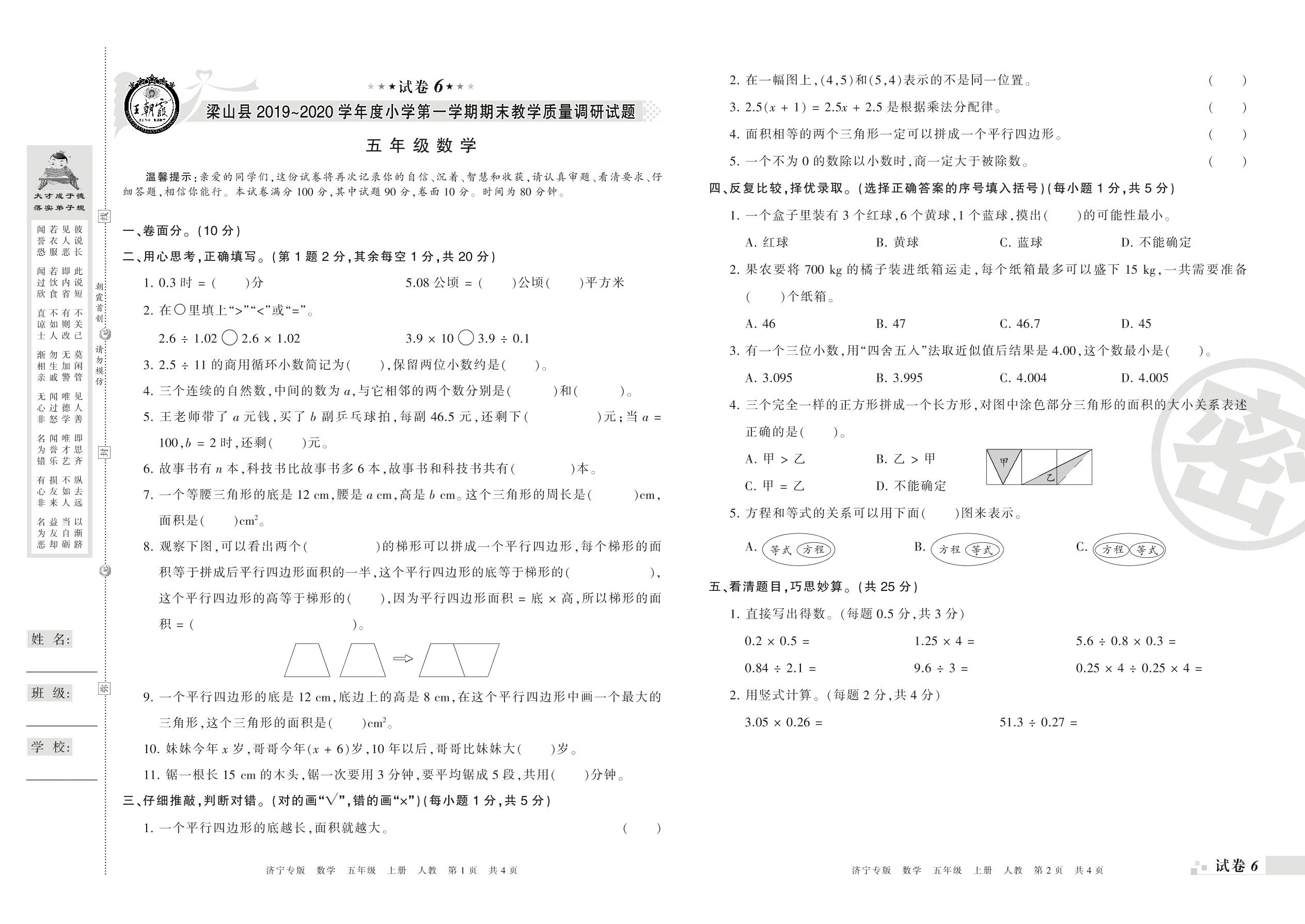 2019-2020学年第一学期济宁市梁山县五年级数学试卷(人教版)【6】