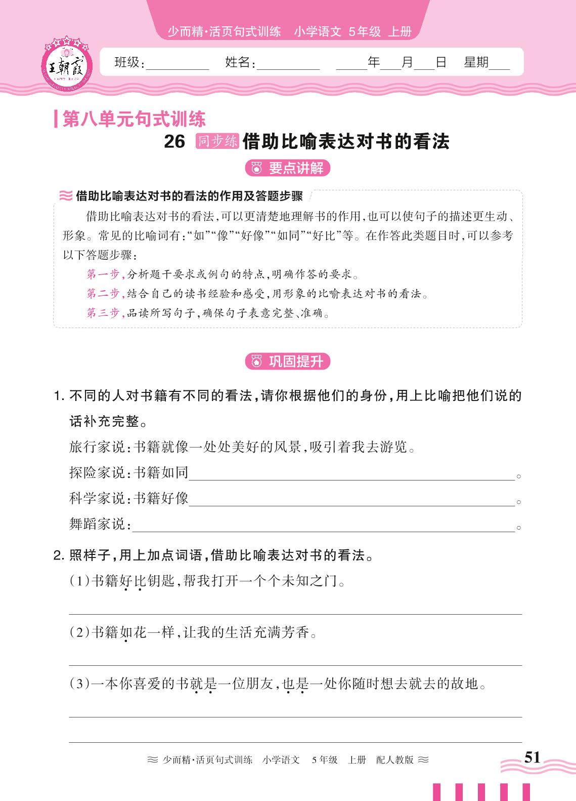 2024秋上册五年级语文人教版 第八单元句式训练——26. 借助比喻表达对书的看法