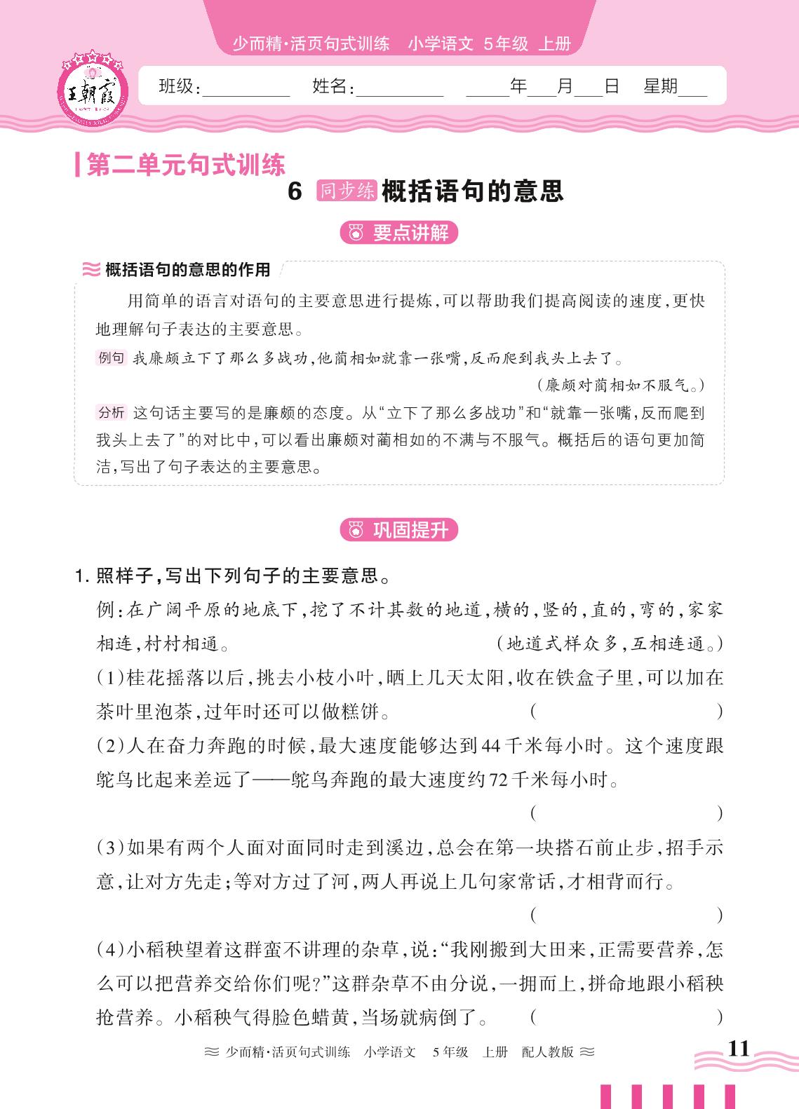 2024秋上册五年级语文人教版 第二单元句式训练——6. 概括语句的意思