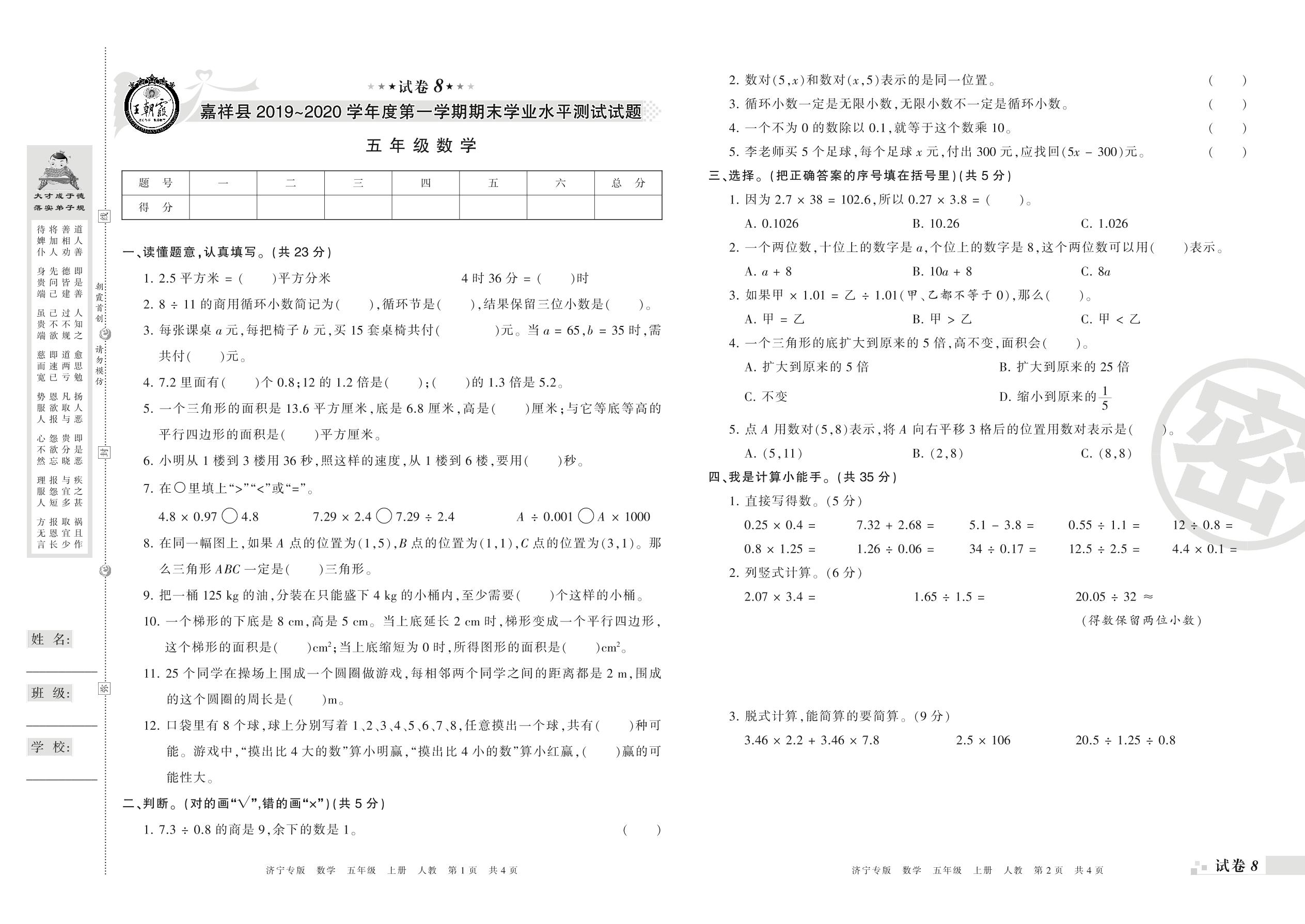 2019-2020学年第一学期济宁市嘉祥县五年级数学试卷(人教版)【8】