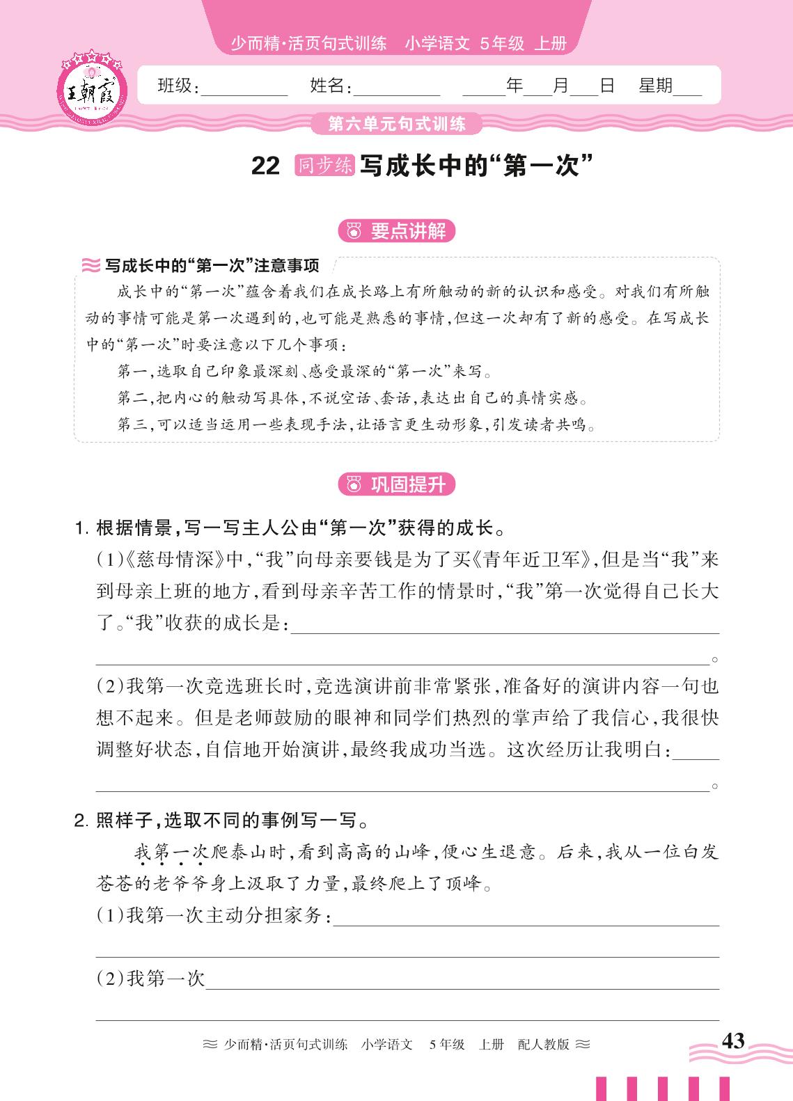 2024秋上册五年级语文人教版 第六单元句式训练——22. 写成长中的“第一次”