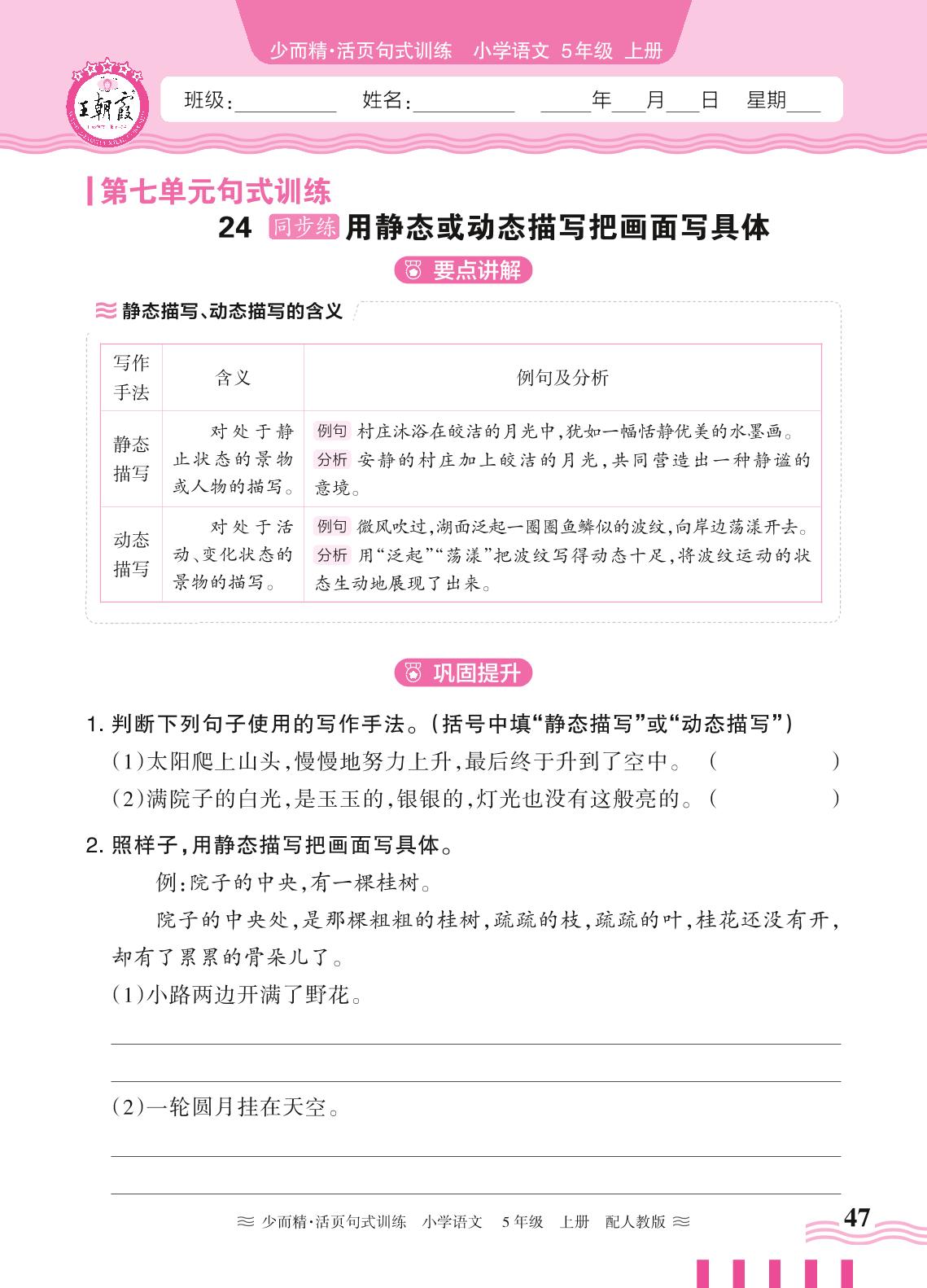 2024秋上册五年级语文人教版 第七单元句式训练——24. 用静态或动态描写把画面写具体