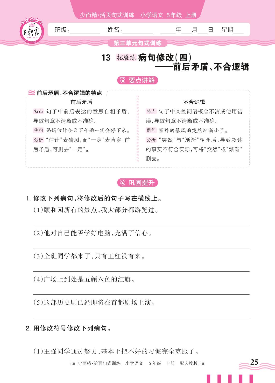2024秋上册五年级语文人教版 第三单元句式训练——13. 病句修改四:前后矛盾、不合逻辑