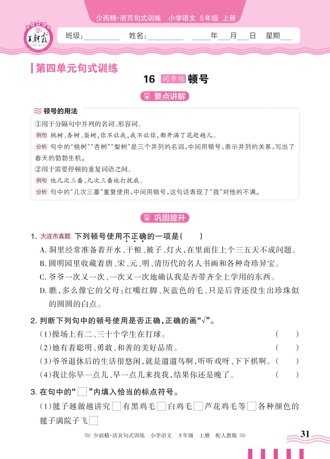 2024秋上册五年级语文人教版 第四单元句式训练——16. 顿号