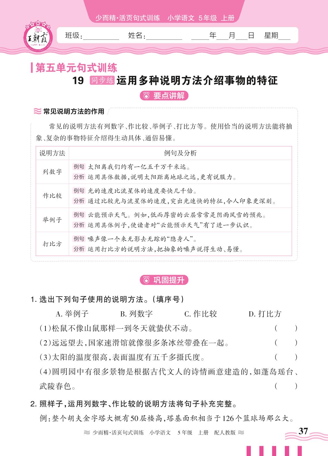 2024秋上册五年级语文人教版 第五单元句式训练——19. 运用多种说明方法介绍事物的特征