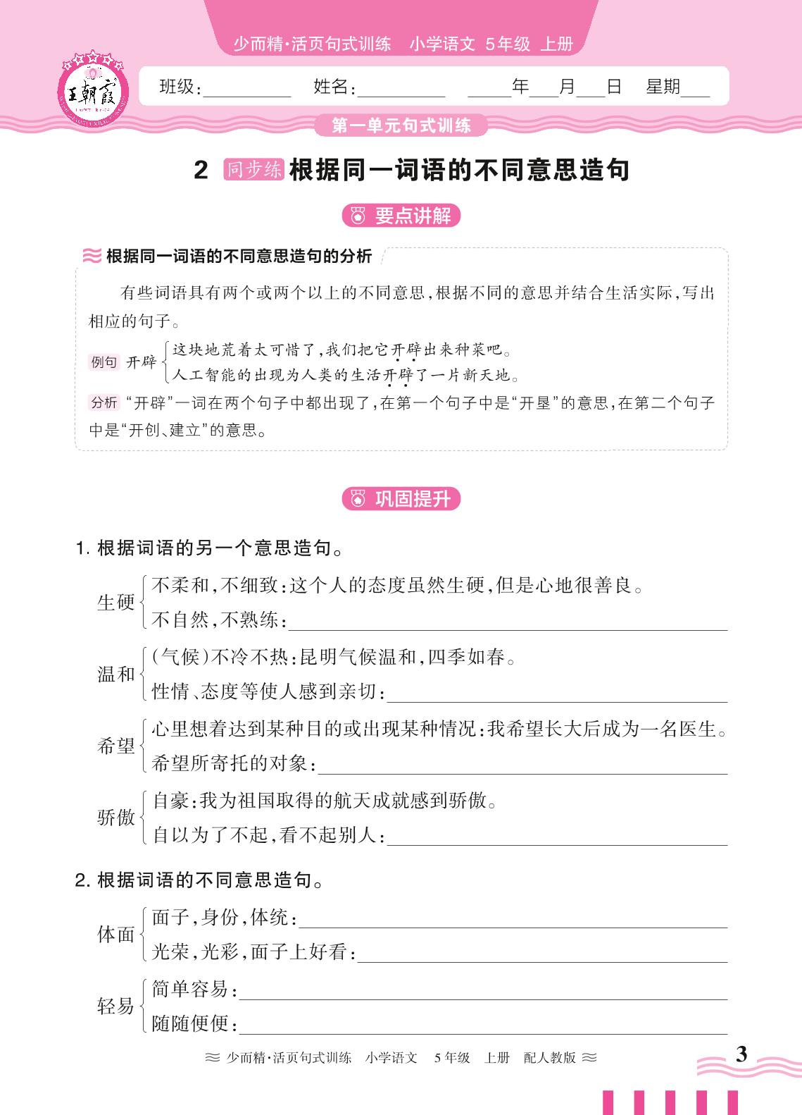 2024秋上册五年级语文人教版 第一单元句式训练——2. 根据同一词语的不同意思造句
