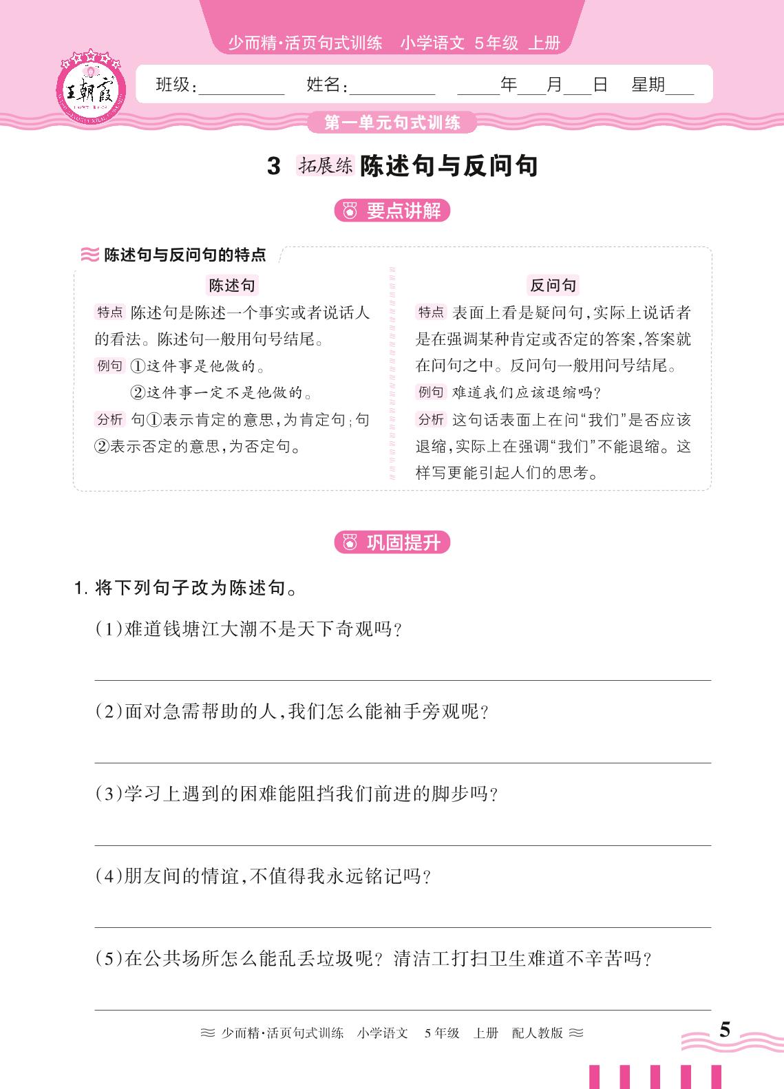 2024秋上册五年级语文人教版 第一单元句式训练——3. 陈述句与反问句