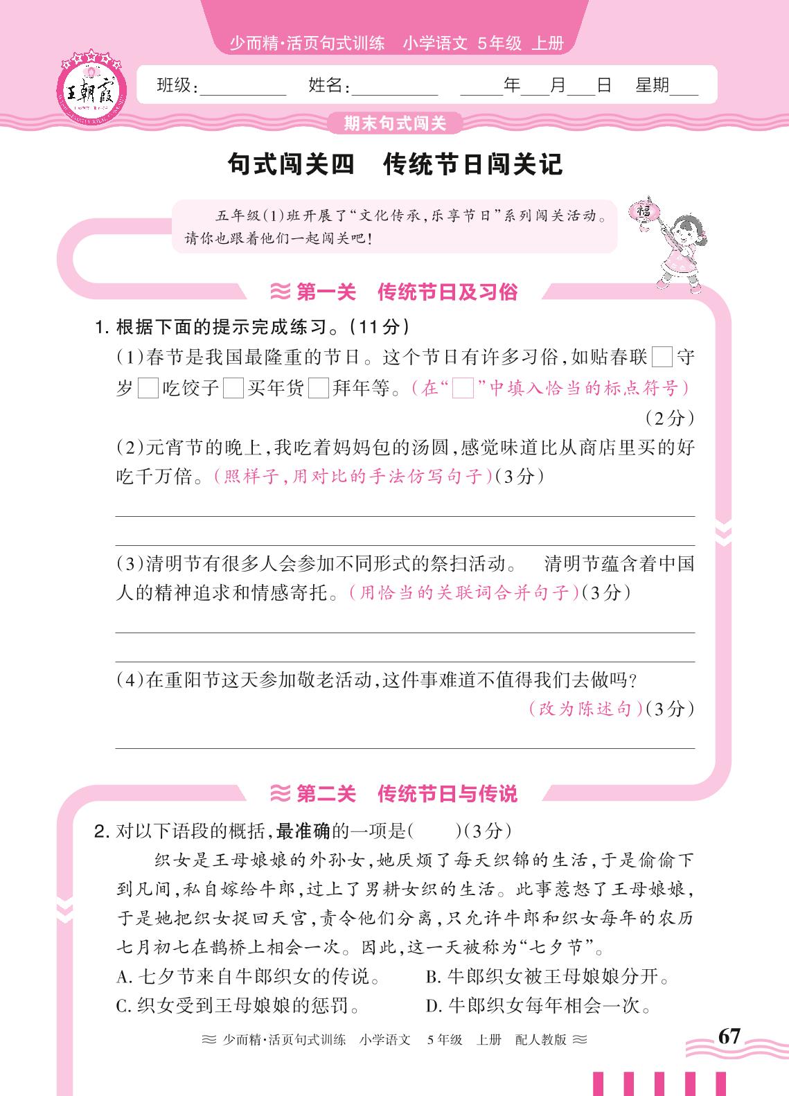 2024秋上册五年级语文人教版 期末句式闯关——句式闯关四:传统节日闯关记