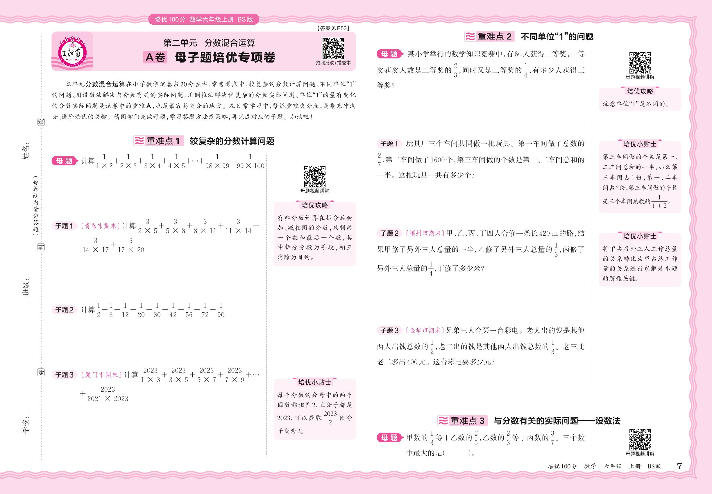 2024秋上册六年级数学北师版 第二单元A卷 母子题培优专项卷