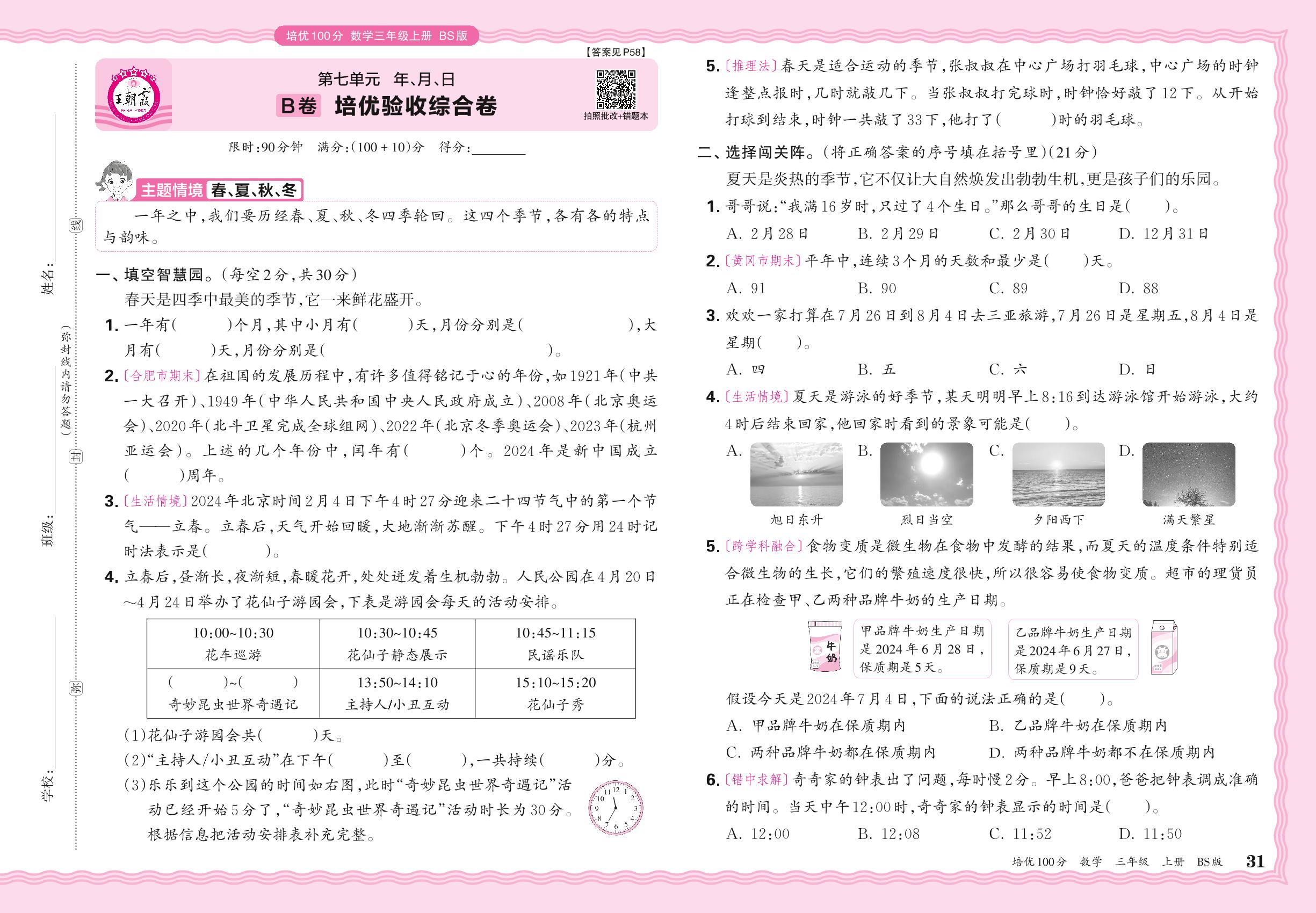 2024秋上册三年级数学北师版 第七单元B卷 培优验收综合卷