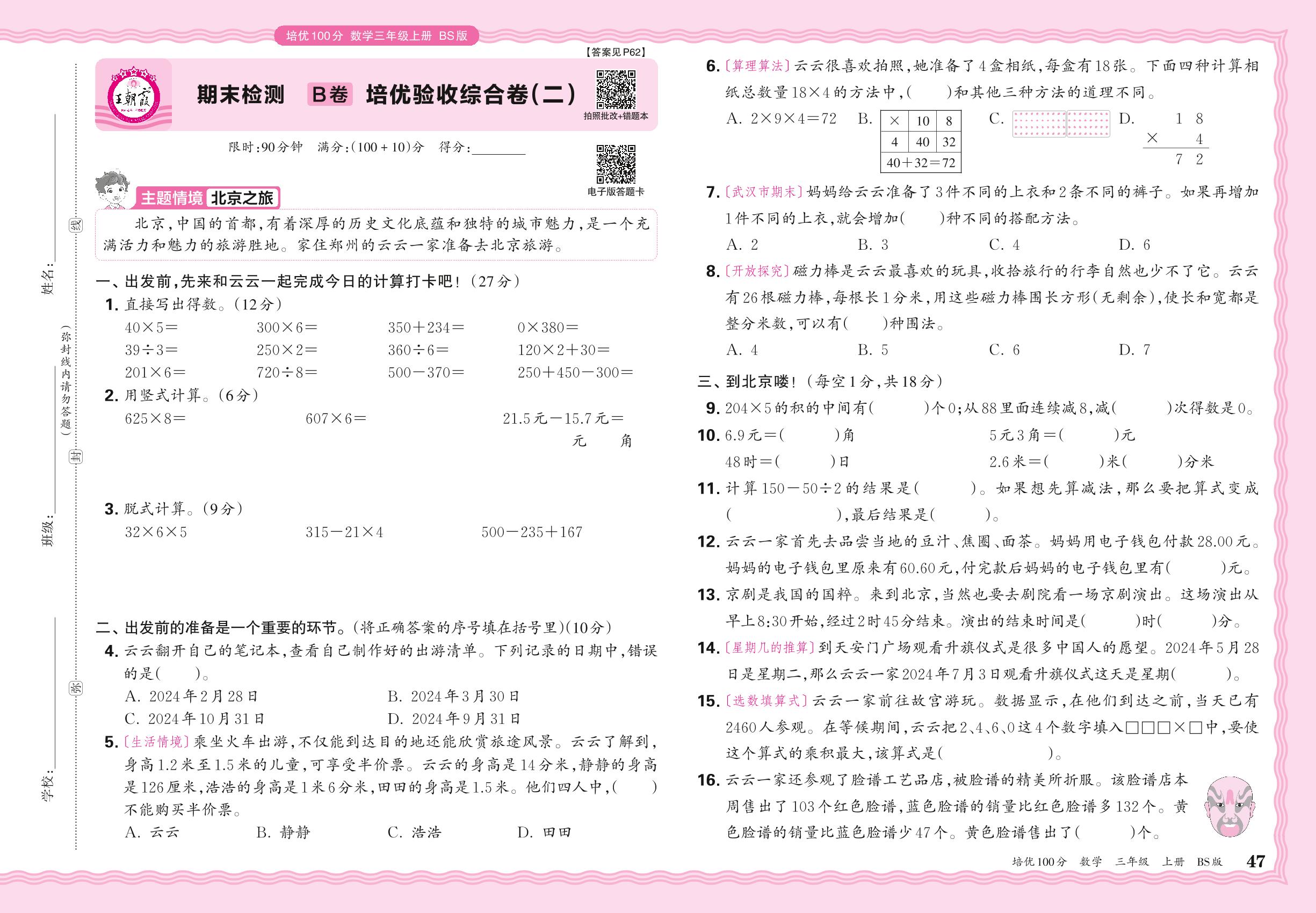 2024秋上册三年级数学北师版 期末检测B卷 培优验收综合卷(二)