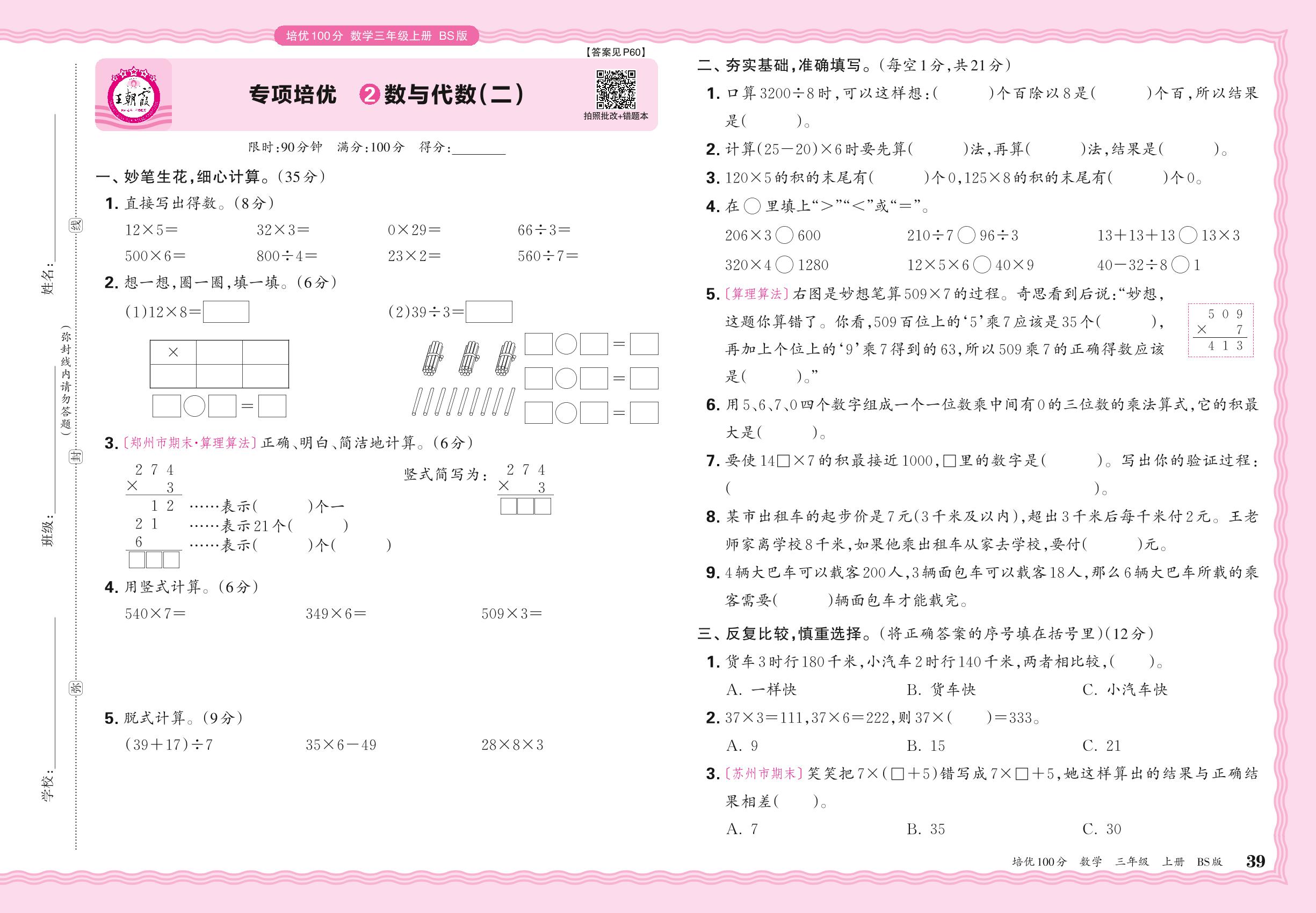 2024秋上册三年级数学北师版 期末专项卷PY版·数与代数(二)【2】