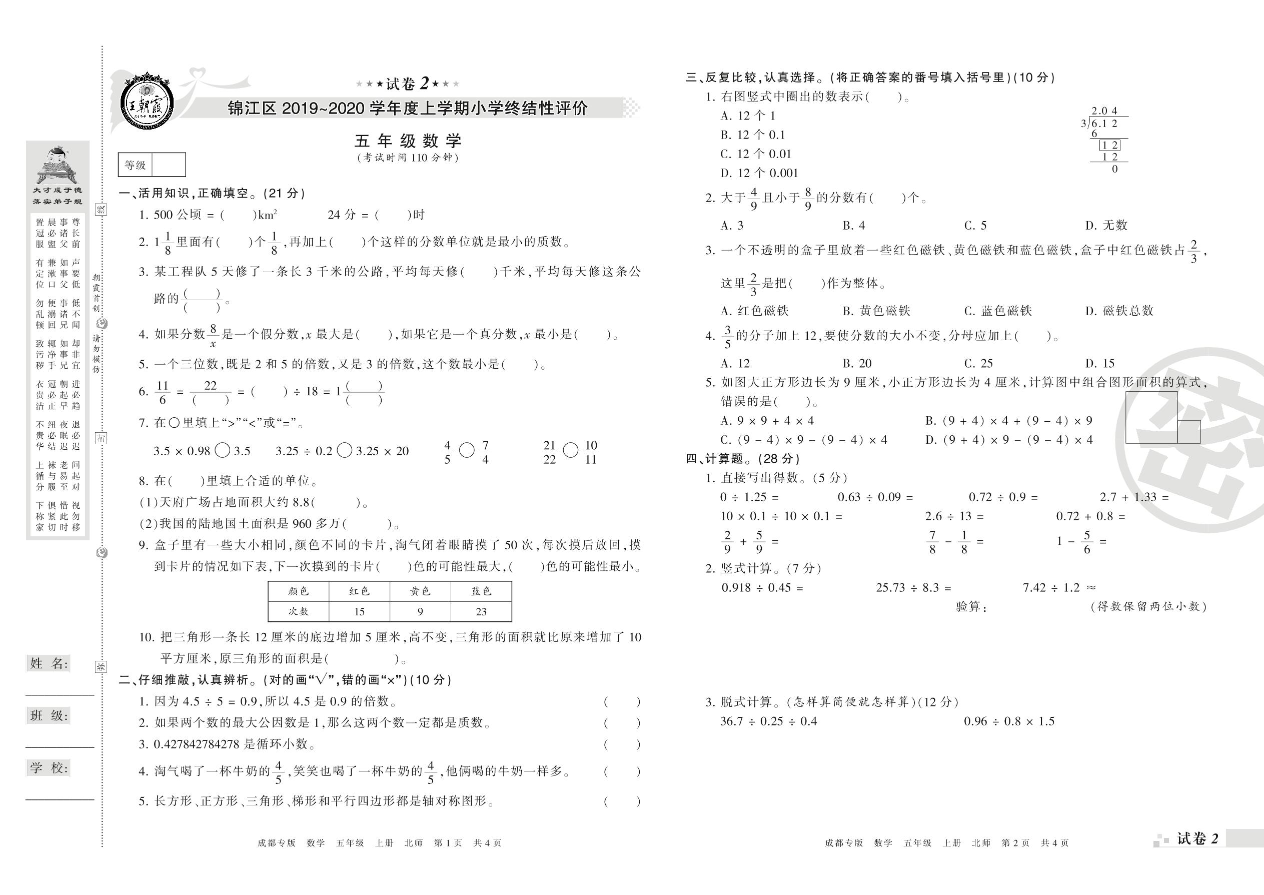 2019-2020学年第一学期成都市锦江区五年级数学试卷(北师版)【2】