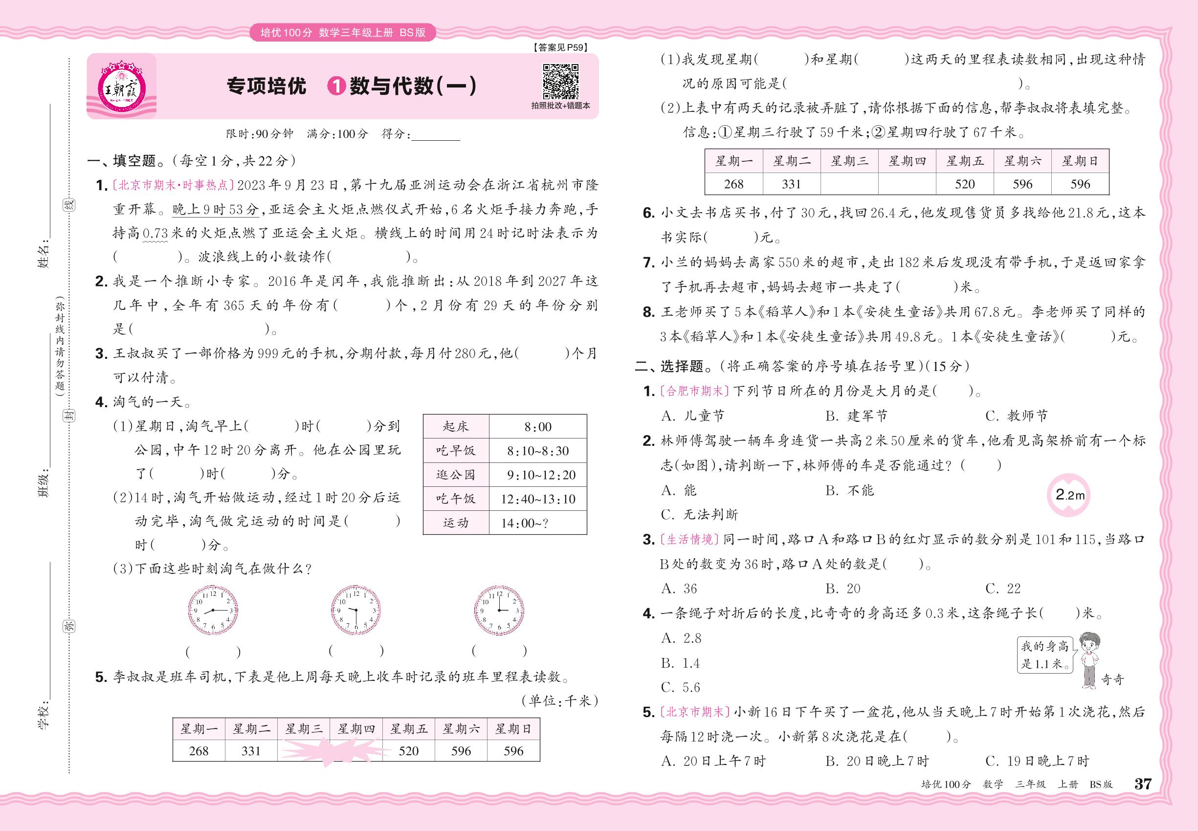 三年级数学北师版上册专项卷