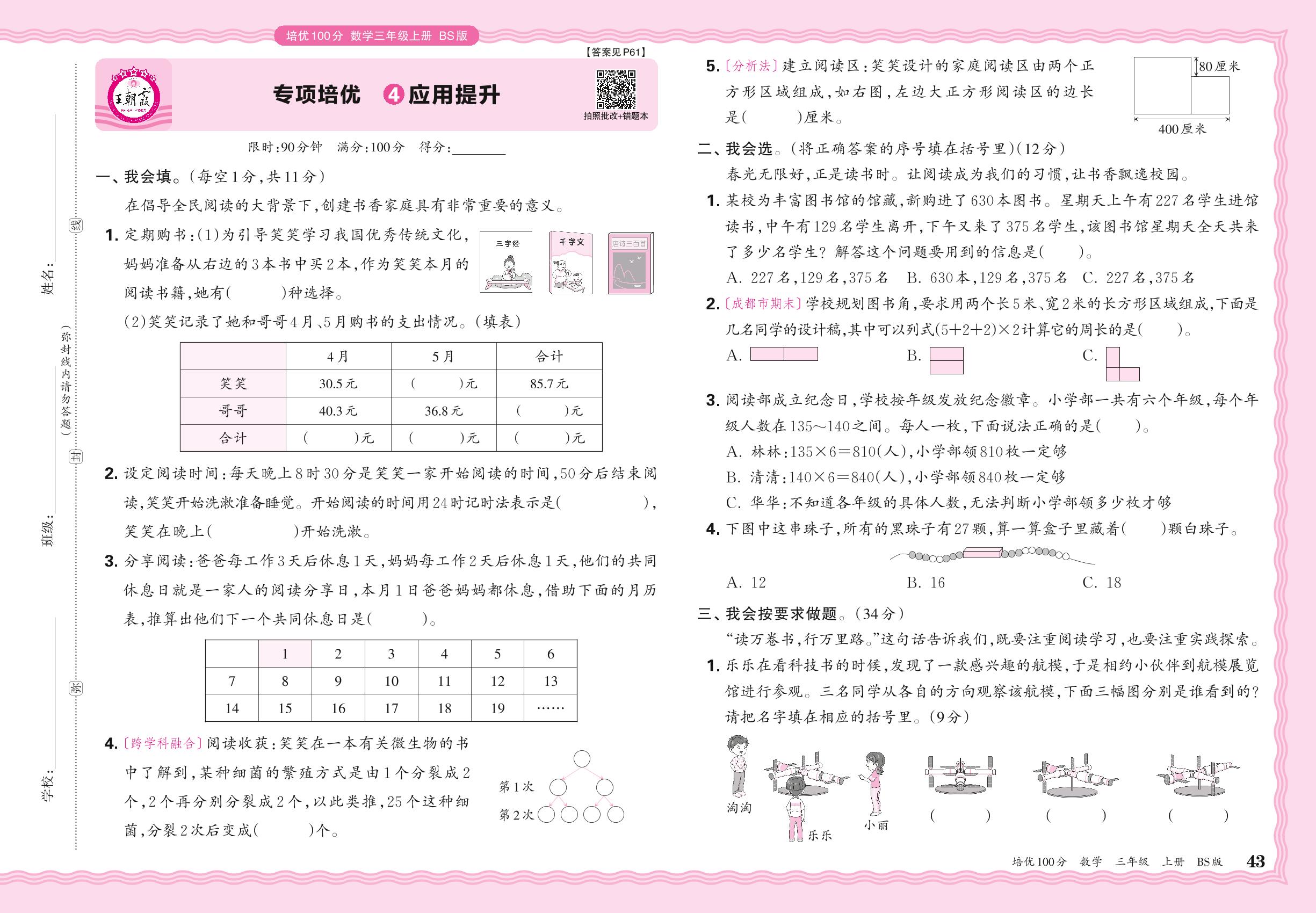 2024秋上册三年级数学北师版 期末专项卷PY版·应用提升【4】