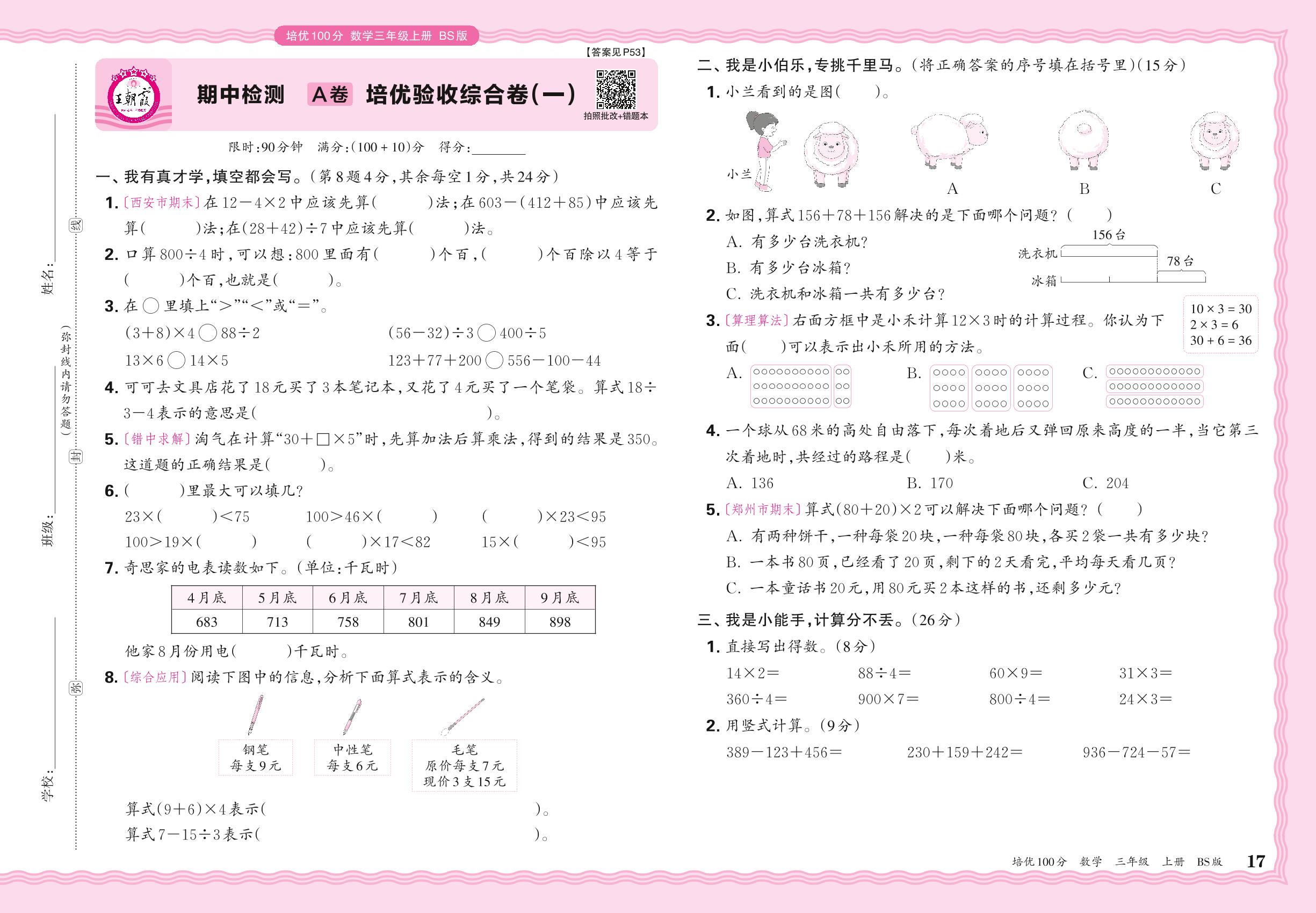 2024秋上册三年级数学北师版 期中检测A卷 培优验收综合卷(一)