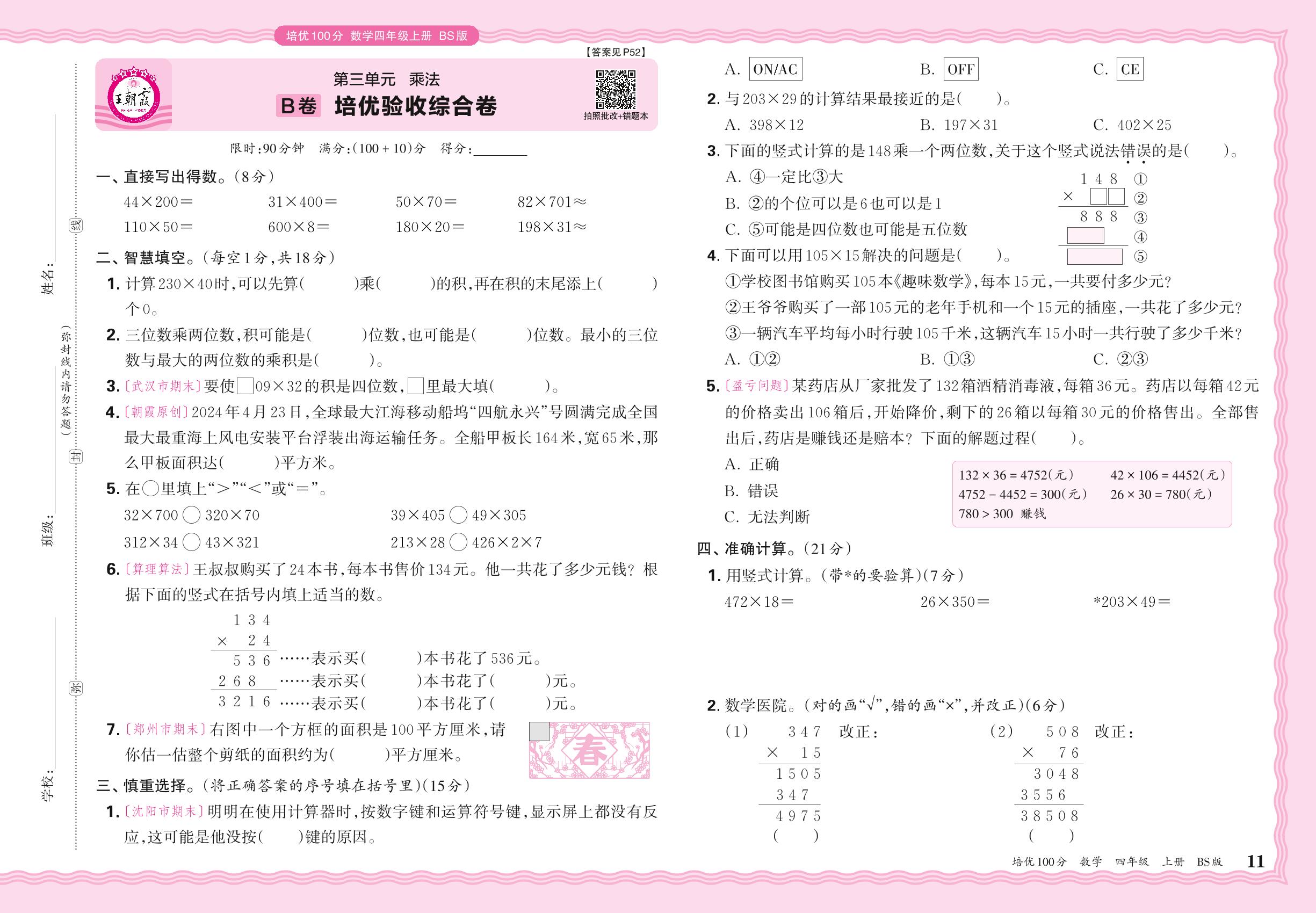 2024秋上册四年级数学北师版 第三单元B卷 培优验收综合卷